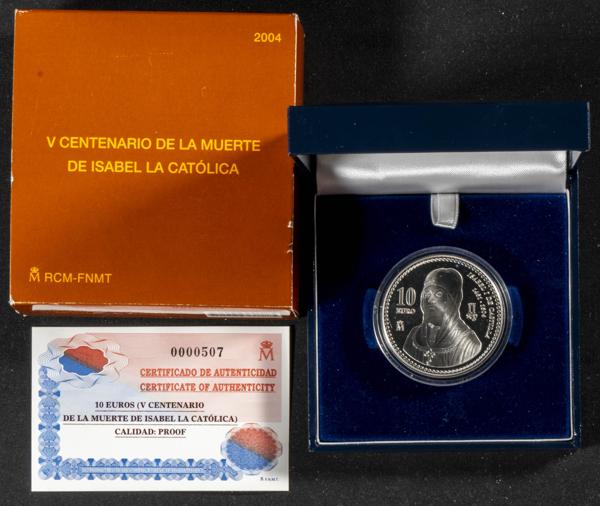 JUAN CARLOS I (1975-2014). 10 Euros (Ar. 27,00g/40mm). 2004. FNMT. V Centenario de la muerte de Isabel la Católica. PROOF. Incluye estuche original y certificado de autenticidad. Tirada de 20.000 unidades.