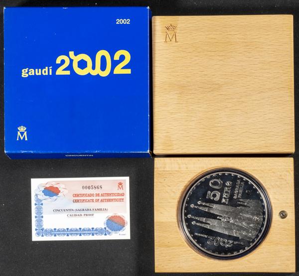 JUAN CARLOS I (1975-2014). 50 Euros. (Ar. 168.75g/73mm). Gaudí. Sagrada Familia. 2002. FNMT. PROOF. Incluye estuche original y certificado de autenticidad. Tirada de 8.000 unidades.