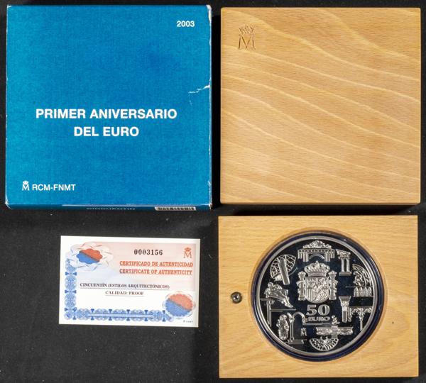 JUAN CARLOS I (1975-2014). Cinquentín ó 50 Euros. (Ar. 168,75g/73mm). Primer Aniversario del Euro. 2003. FNMT. PROOF. Presentado en estuche oficial y con certificado de autenticidad. Sólo 20 mil unidades emitidas.