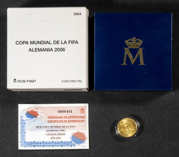 JUAN CARLOS I (1975-2014). 100 Euros (Au. 6,75g/23mm). Copa Mundial de la FIFA. Alemania 2006. 2004. FNMT. PROOF. Oro de 0,999 milésimas. Incluye estuche original y certificado de autenticidad.