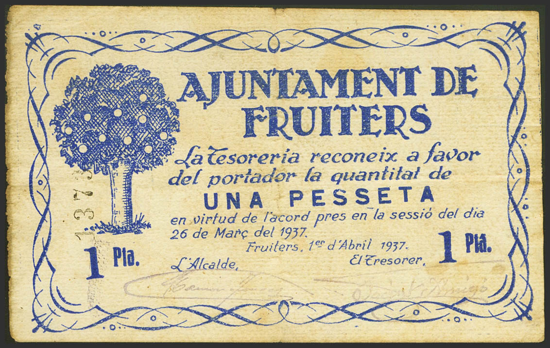 FRUITERS (BARCELONA). 1 Peseta. 1 de Abril de 1937. (González: 7937). Raro. MBC.