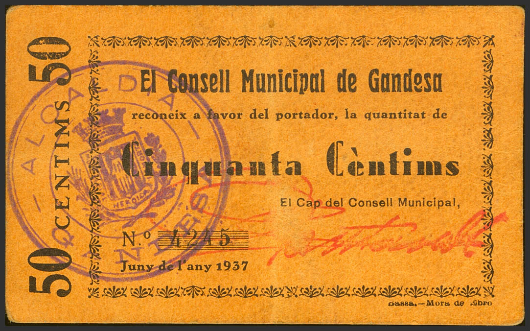 GANDESA (TARRAGONA). 50 Céntimos. Junio de 1937 (González: 7959). EBC-.