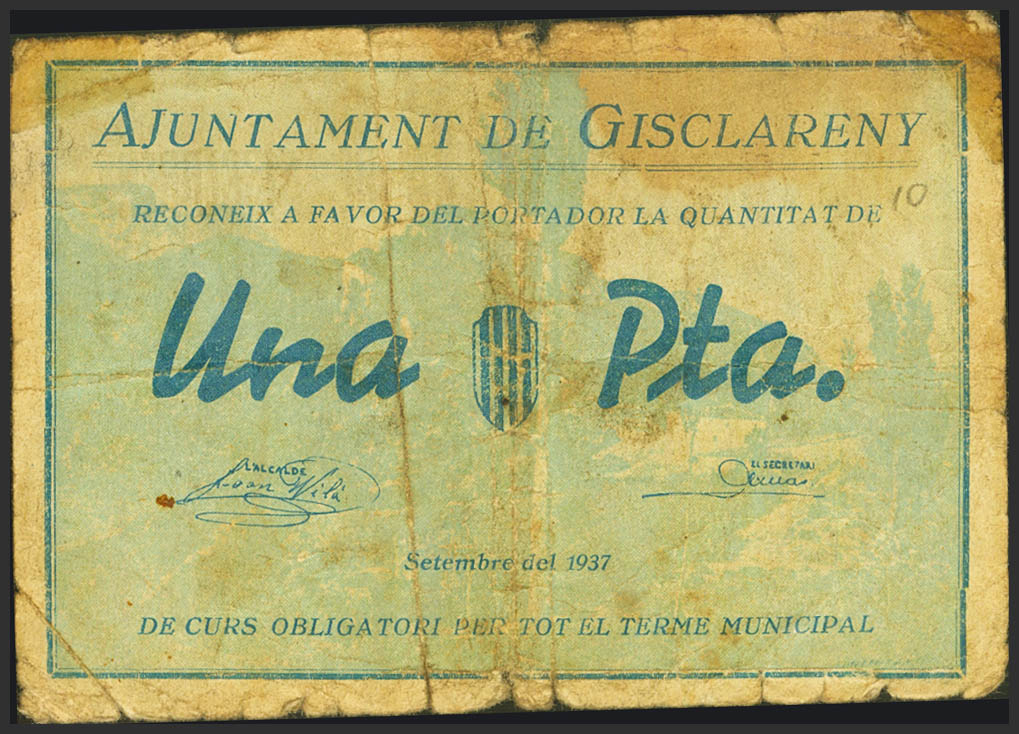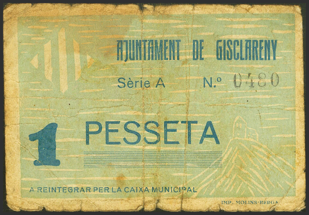 GISCLARENY (BARCELONA). 1 Peseta. Septiembre de 1937. Serie A. (González: 8052). Muy raro. BC.