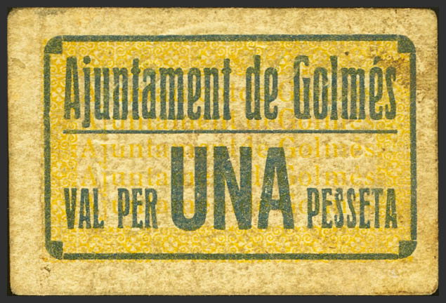 GOLMES (LERIDA). 1 Peseta. (1937ca). (González: 8063). Muy raro. EBC-.