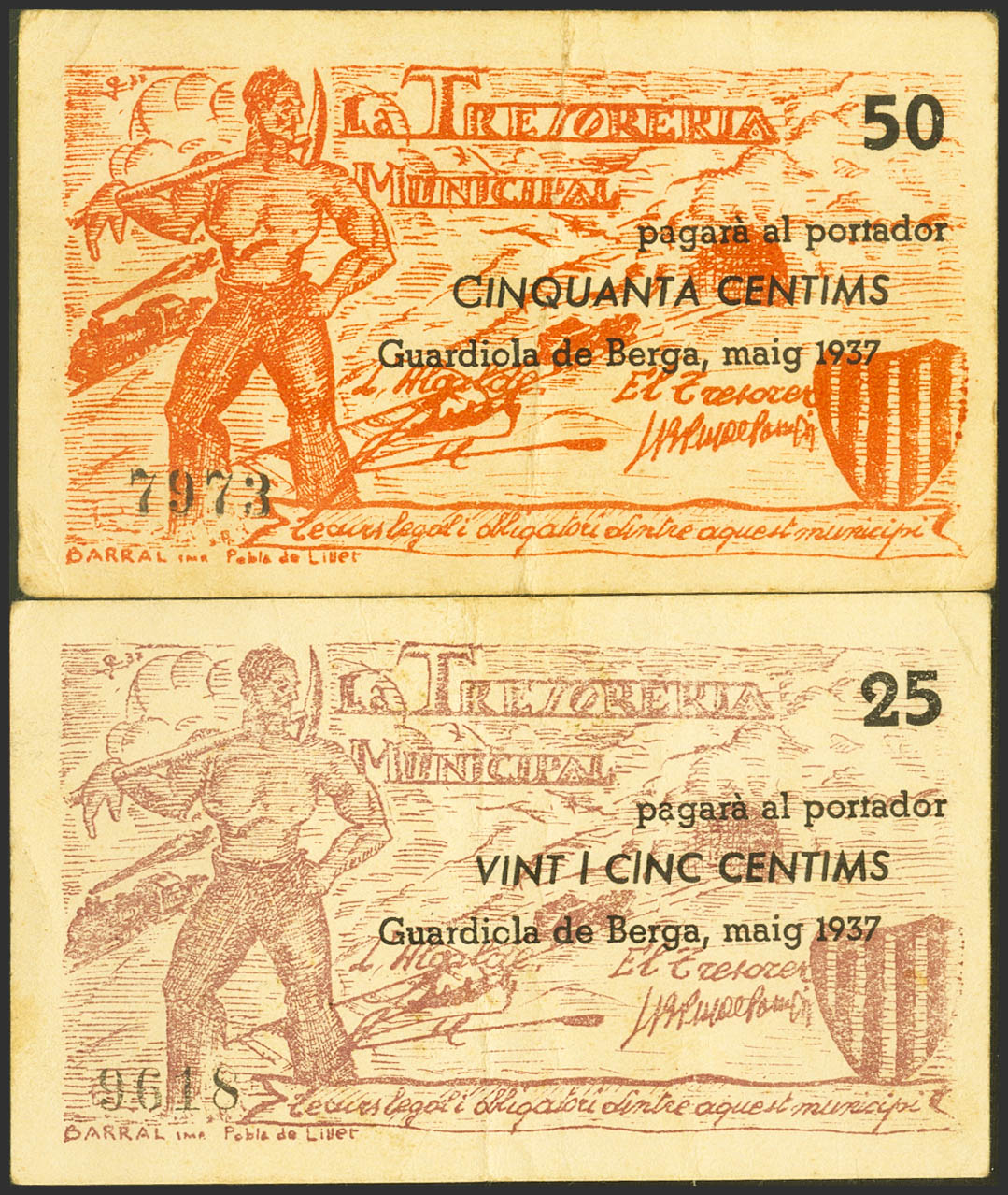 GUARDIOLA DE BAGES (BARCELONA). 25 Céntimos y 50 Céntimos. Mayo de 1937. (González: 8148, 8149). MBC+.