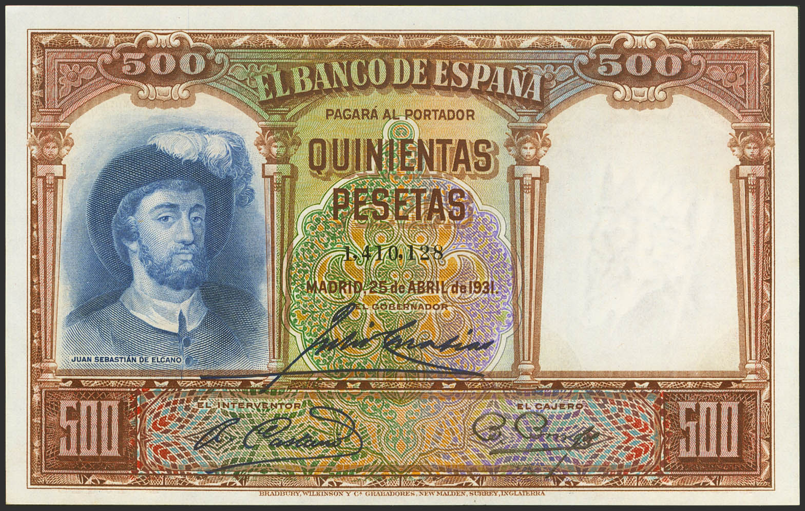 500 Pesetas. 25 de Abril de 1931. Sin serie. (Edifil 2021: 361). Conserva todo el apresto original. SC-.
