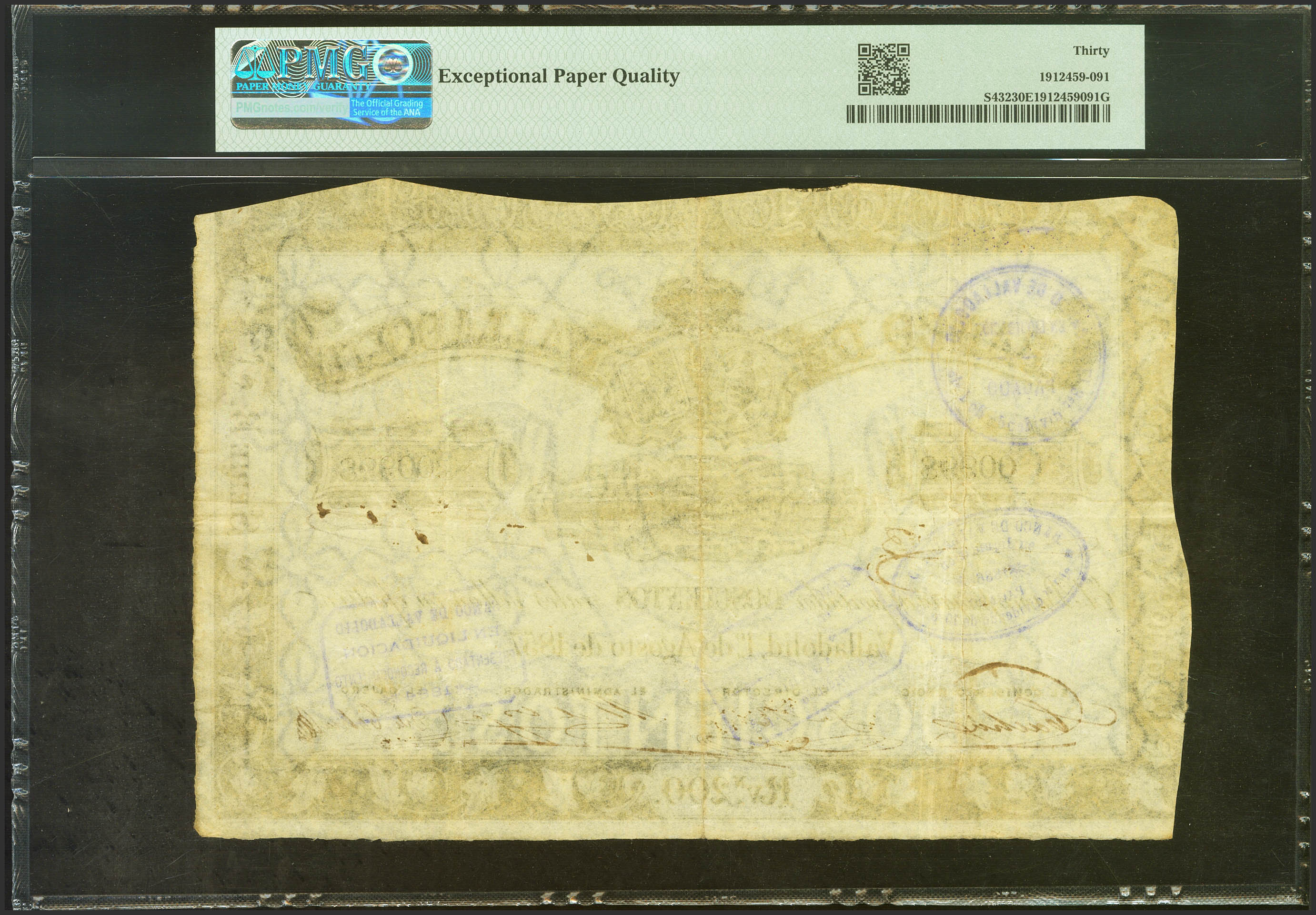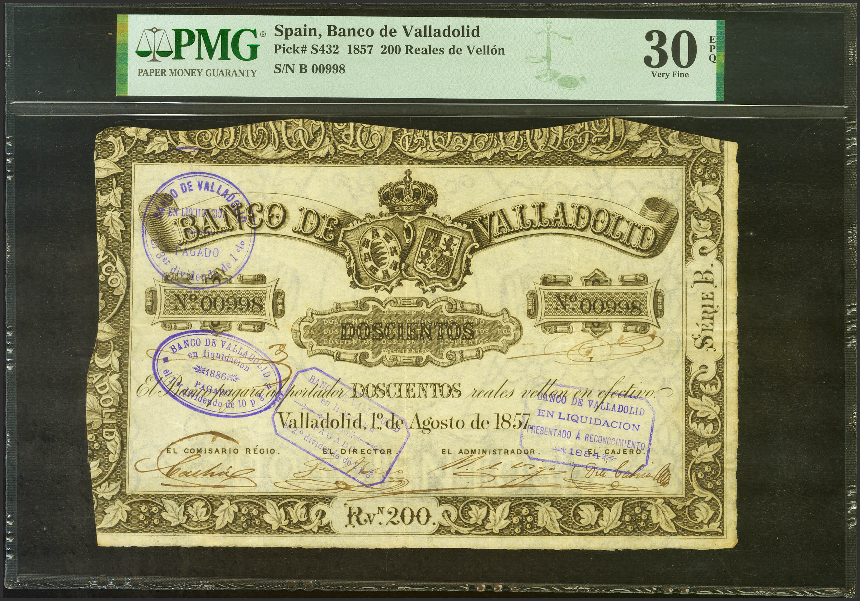 200 Reales de Vellón. 1 de Agosto de 1857. Banco de Valladolid. Serie B. (Edifil 2021: 132, Pick: S432). Muy raro, especialmente conservando su apresto original. MBC+. Encapsulado PMG30EPQ.