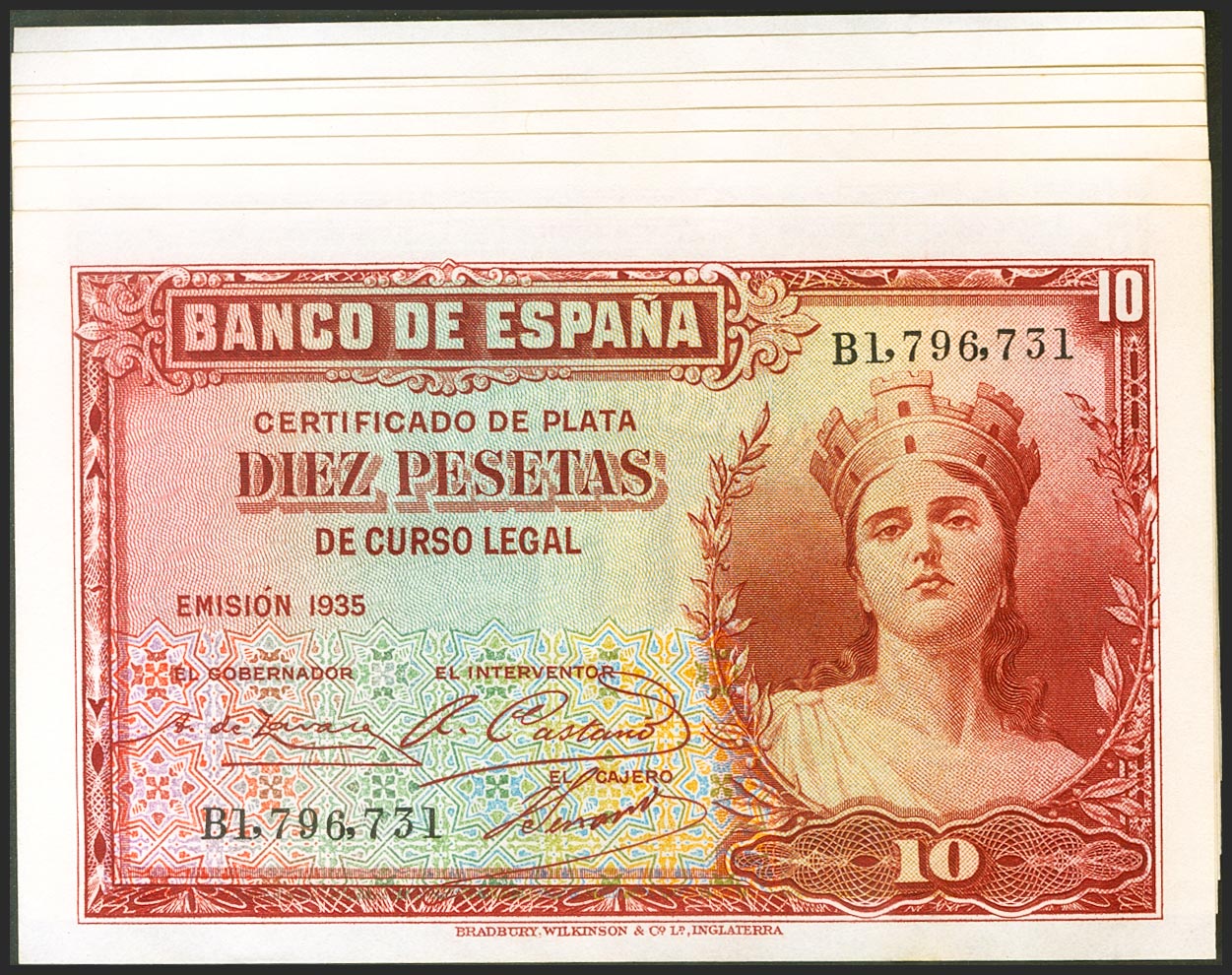 Conjunto de 9 billetes correlativos de 10 Pesetas Certificado de Plata emitidos en 1935 y con la serie B (Edifil 2021: 364a), conservando todo su apresto original. SC.