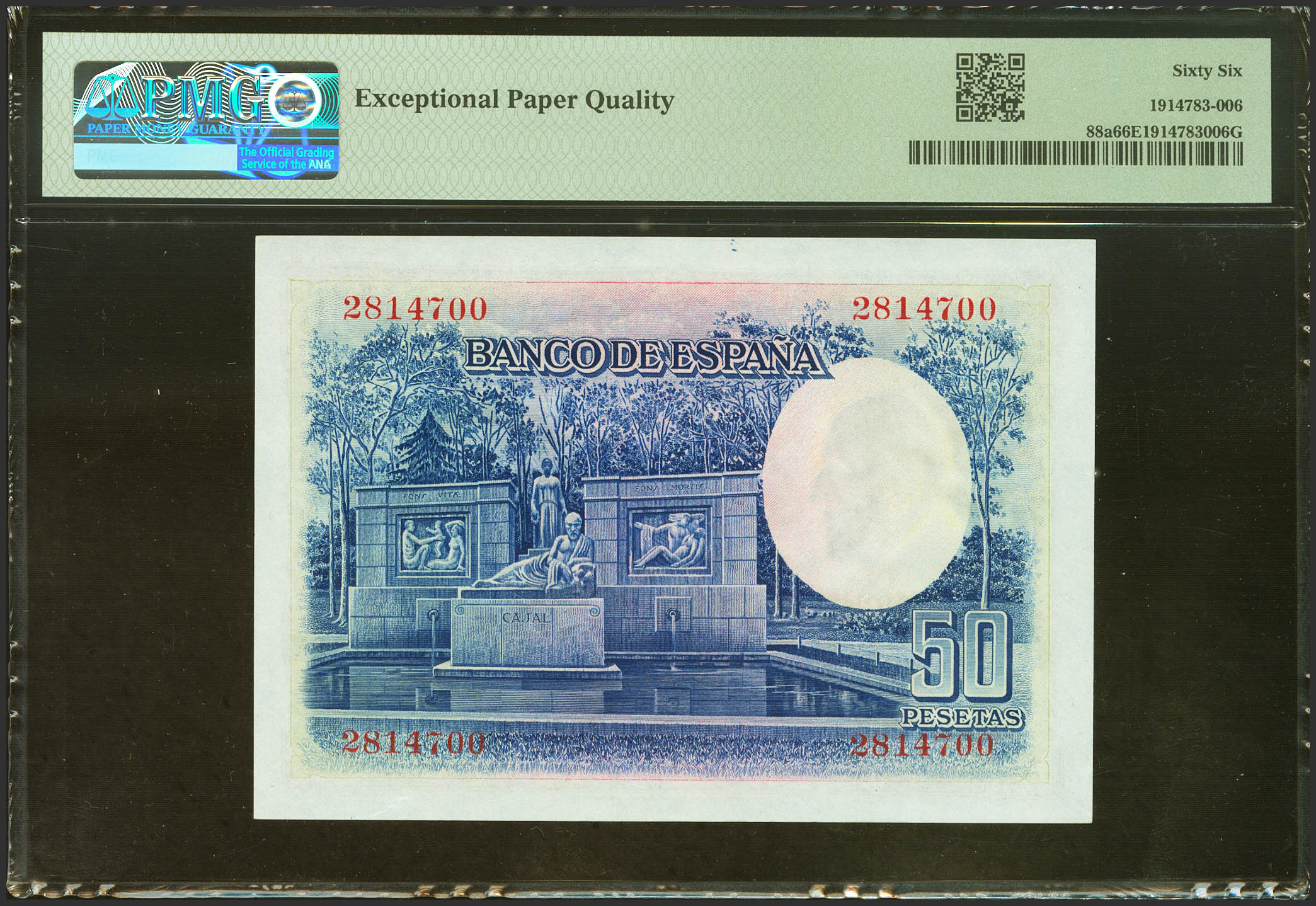 50 Pesetas. 22 de Julio de 1935. Sin serie. (Edifil 2021: 366, Pick: 88a). Inusual en esta calidad, apresto original. SC. Encapsulado PMG66EPQ.
