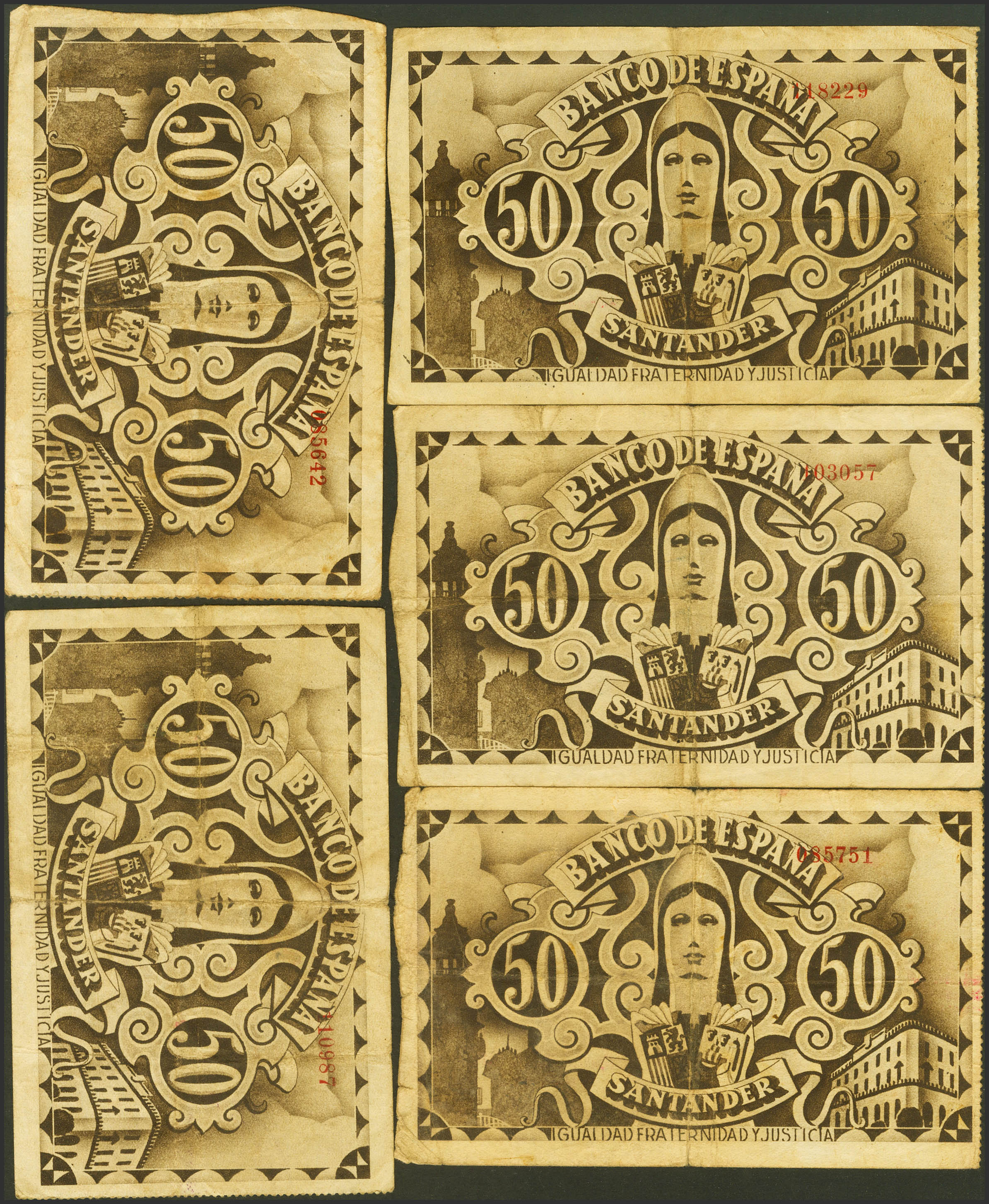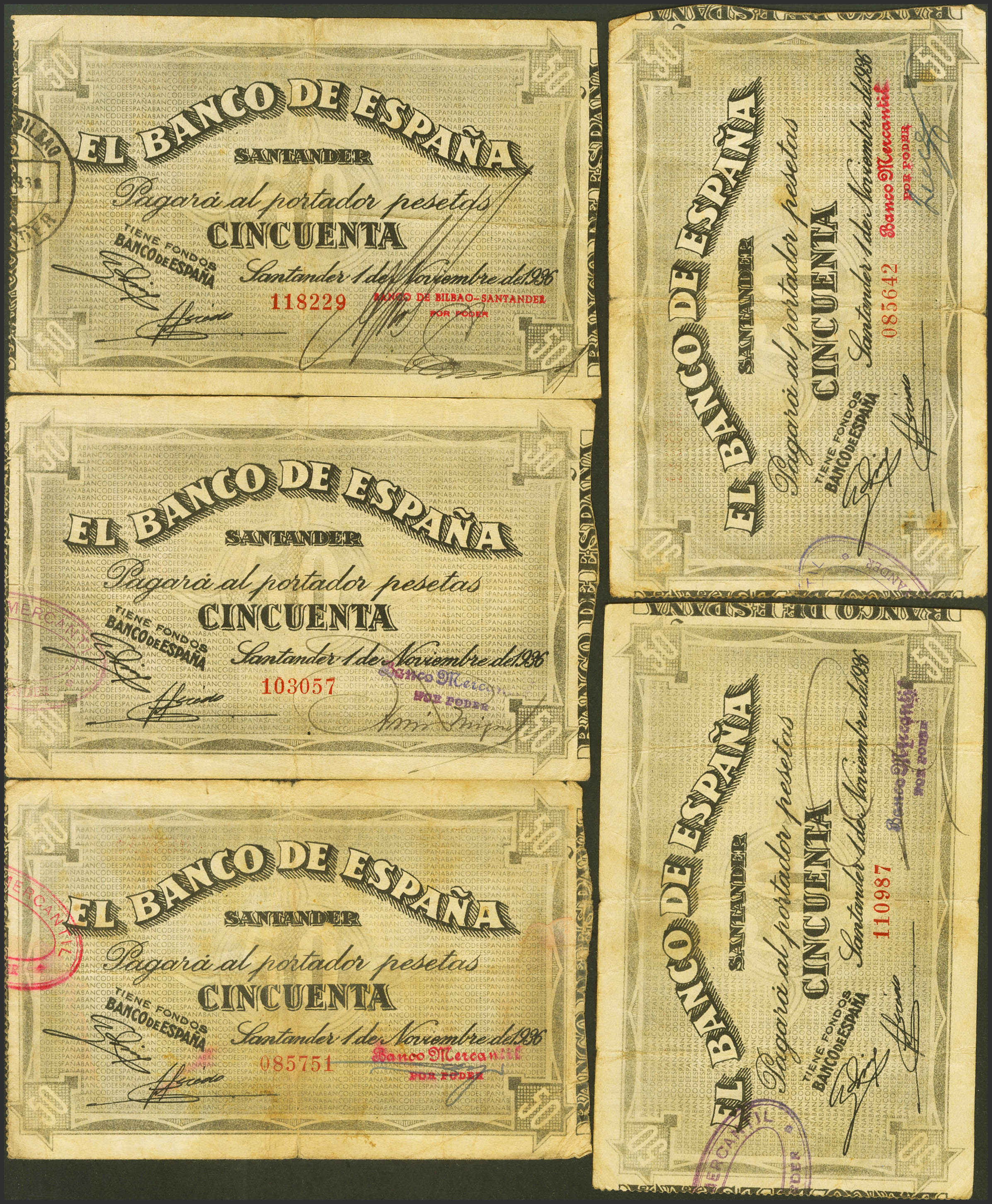 Conjunto de 5 billetes de 50 Pesetas del Banco de Santander, emitidos el 1 de Noviembre de 1936, todos ellos sin serie y con diversas antefirmas. (Edifil 2023: 378). MBC.