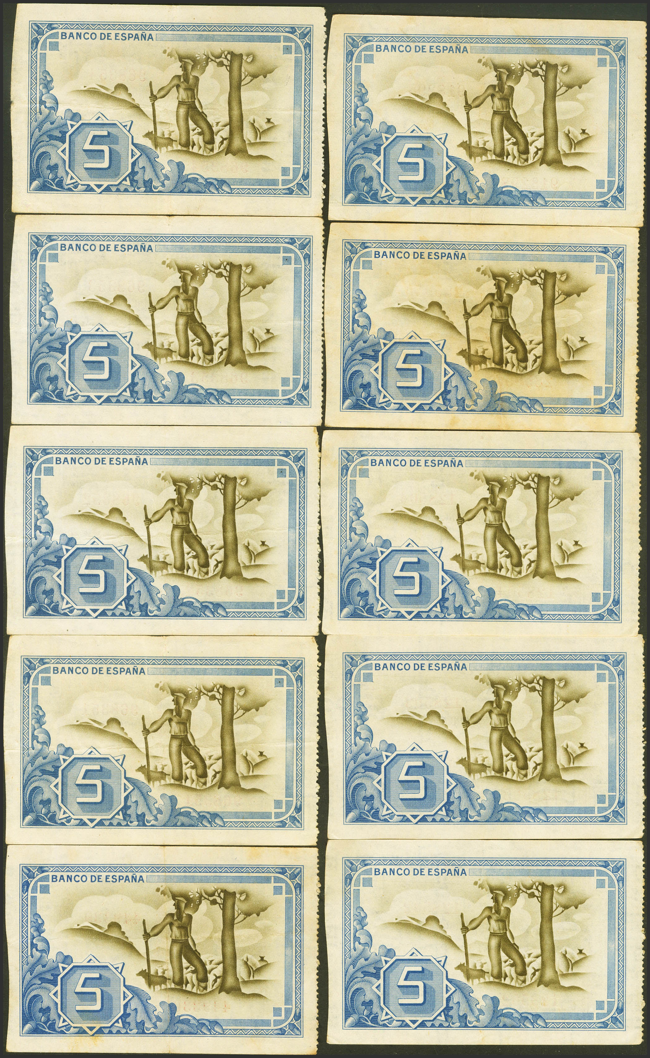Conjunto de 10 billetes, varios de ellos correlativos, de 5 Pesetas del Banco de Bilbao, emitidos el 1 de Enero de 1937, todos ellos sin serie y con diversas antefirmas. (Edifil 2023: 385). EBC/MBC+.