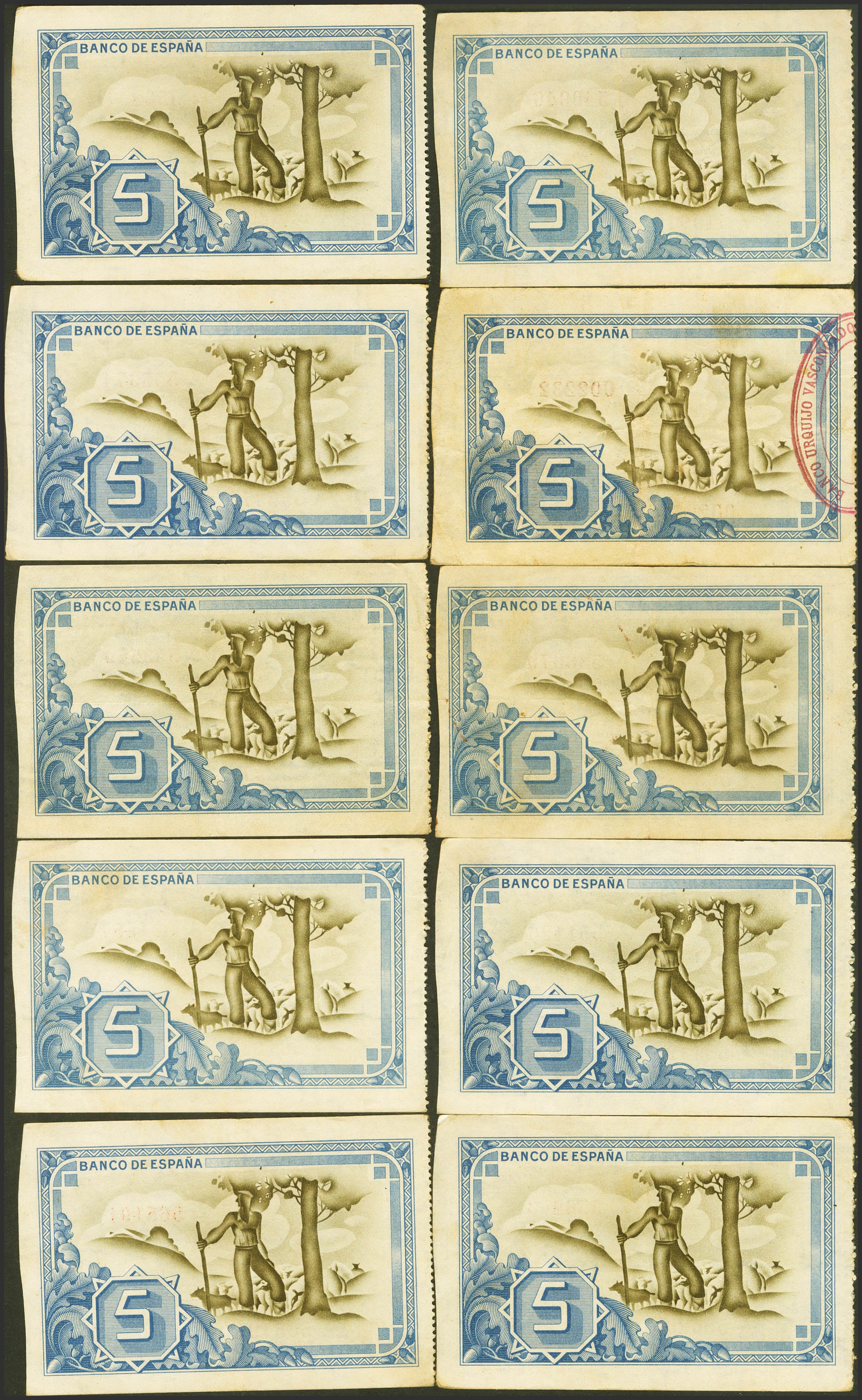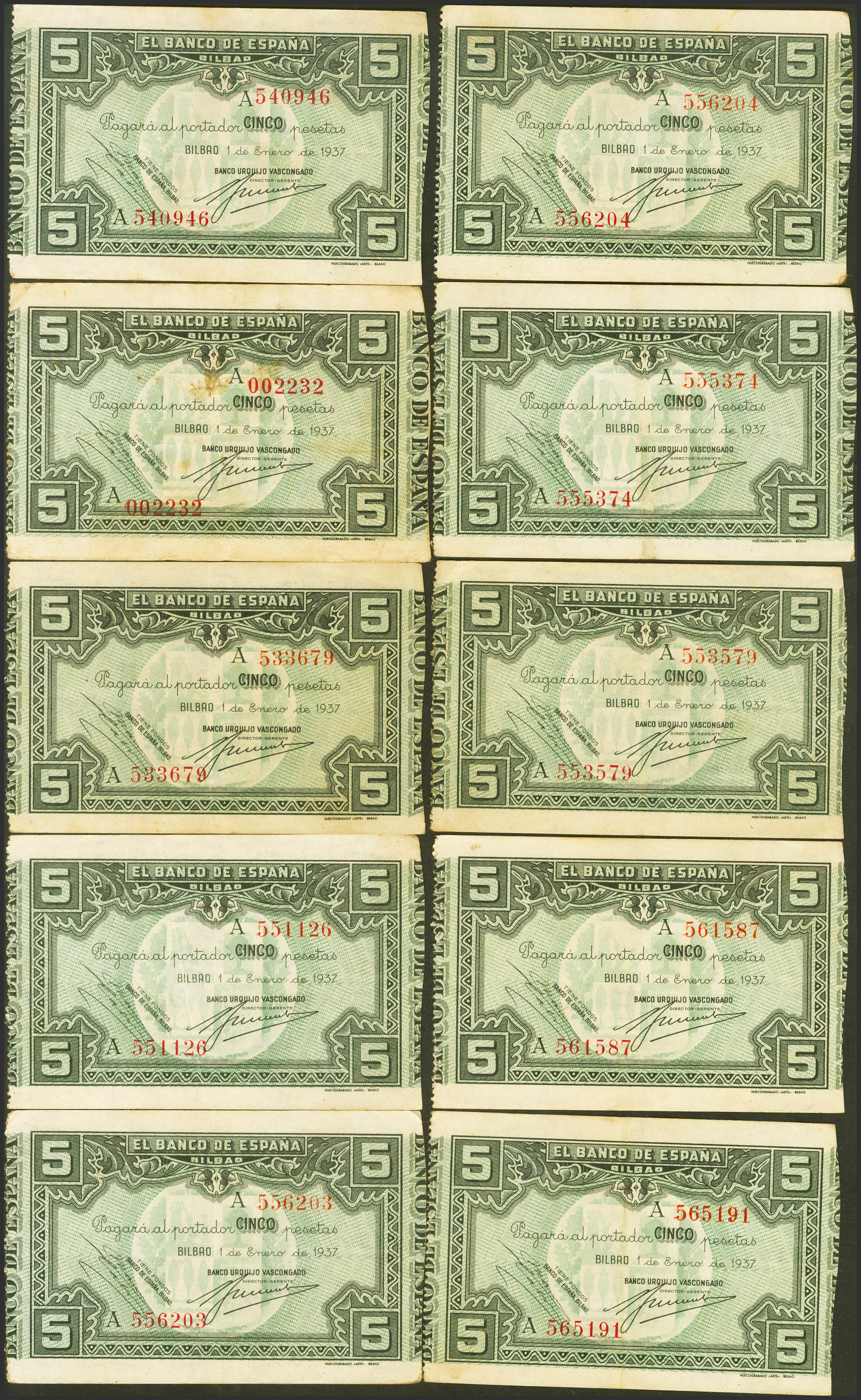 Conjunto de 10 billetes, incluyendo una pareja correlativa, de 5 Pesetas del Banco de Bilbao, emitidos el 1 de Enero de 1937, todos ellos sin serie y con diversas antefirmas. (Edifil 2023: 385). EBC/MBC+.