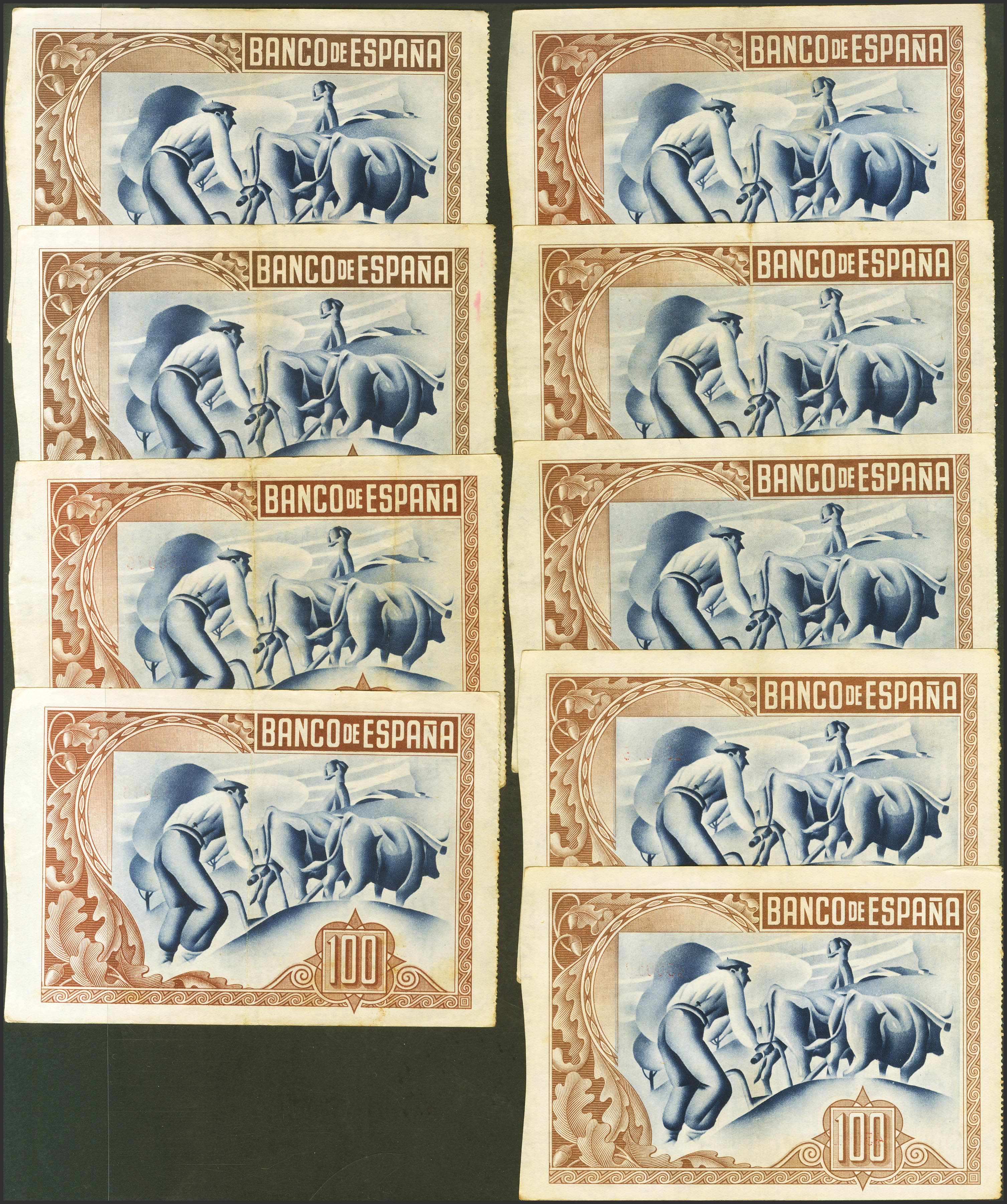 Conjunto de 9 billetes, varios de ellos correlativos, de 100 Pesetas del Banco de Bilbao, emitidos el 1 de Enero de 1937, todos ellos sin serie y con diversas antefirmas. (Edifil 2023: 390). EBC/MBC+.