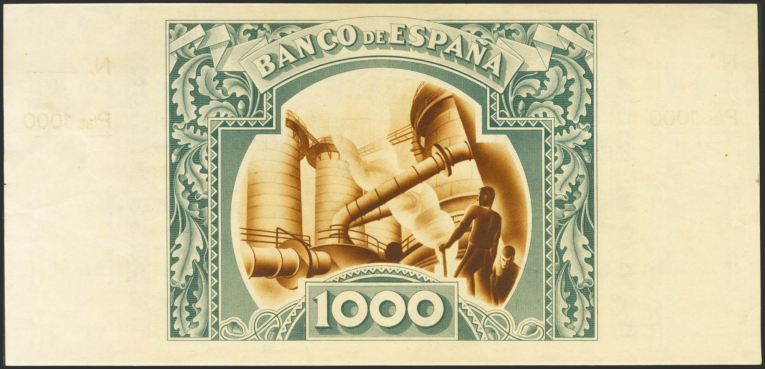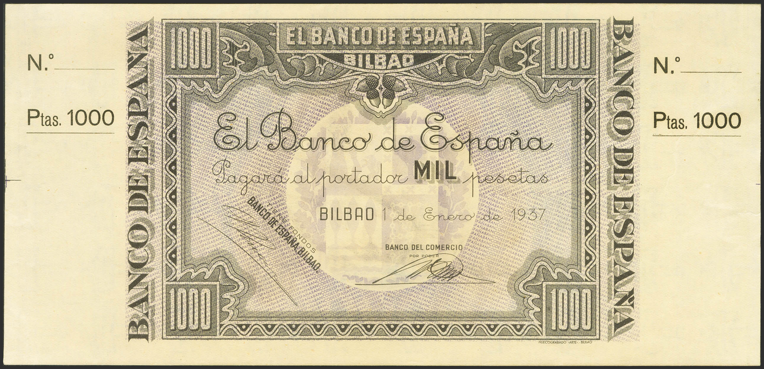 1000 Pesetas. 1 de Enero de 1937. Sucursal de Bilbao, antefirma Banco de Comercio. No emitido, sin serie y sin numeración, con ambas matrices. (Edifil 2023: NE27c). Apresto original. SC--.