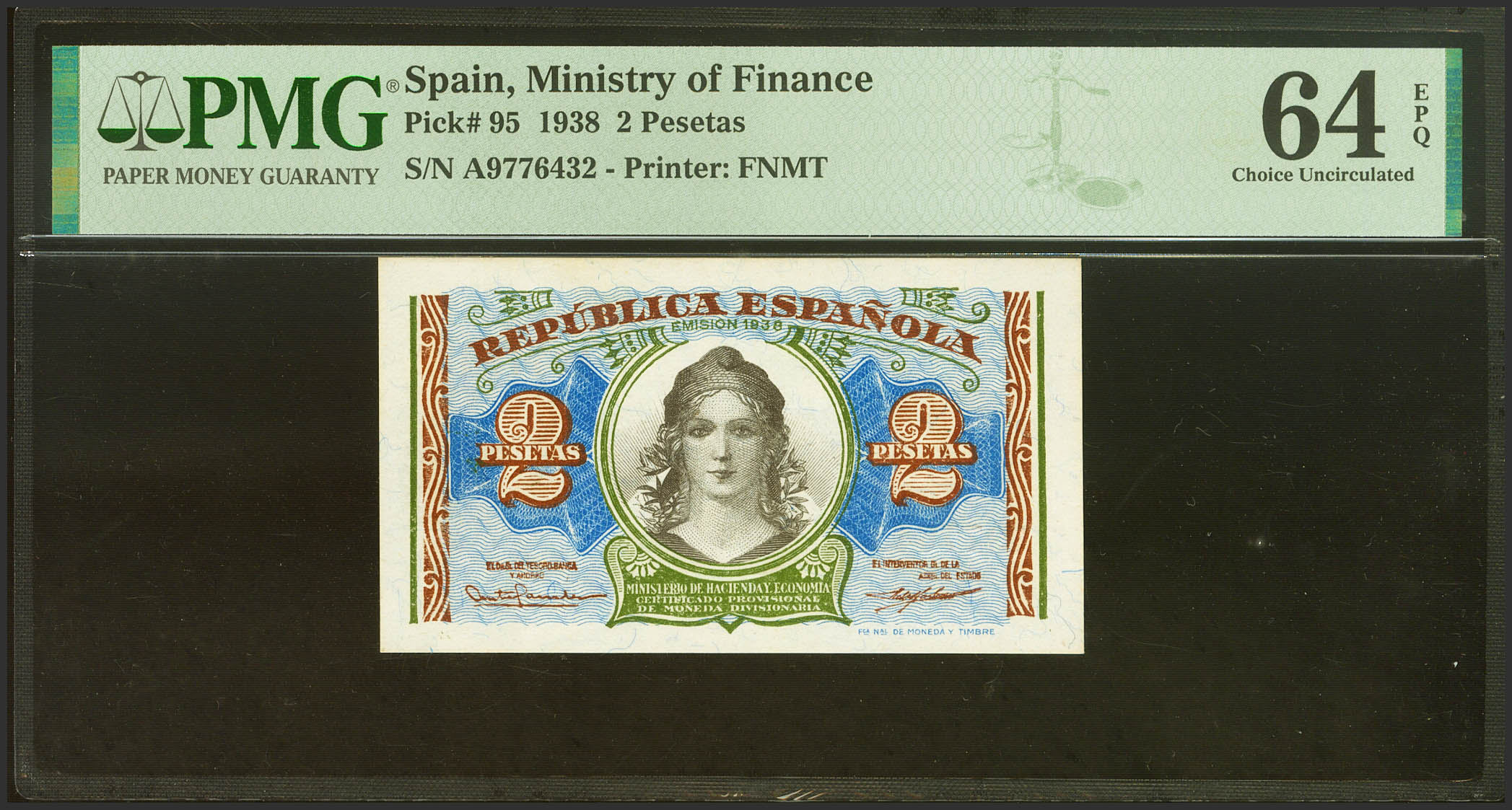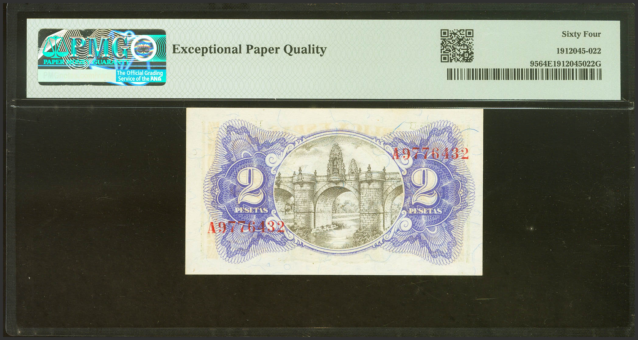 2 Pesetas. 1938. Ministerio de Hacienda. Serie A. (Edifil 2023: 393, Pick: 95). Apresto original. SC. Encapsulado PMG64EPQ.