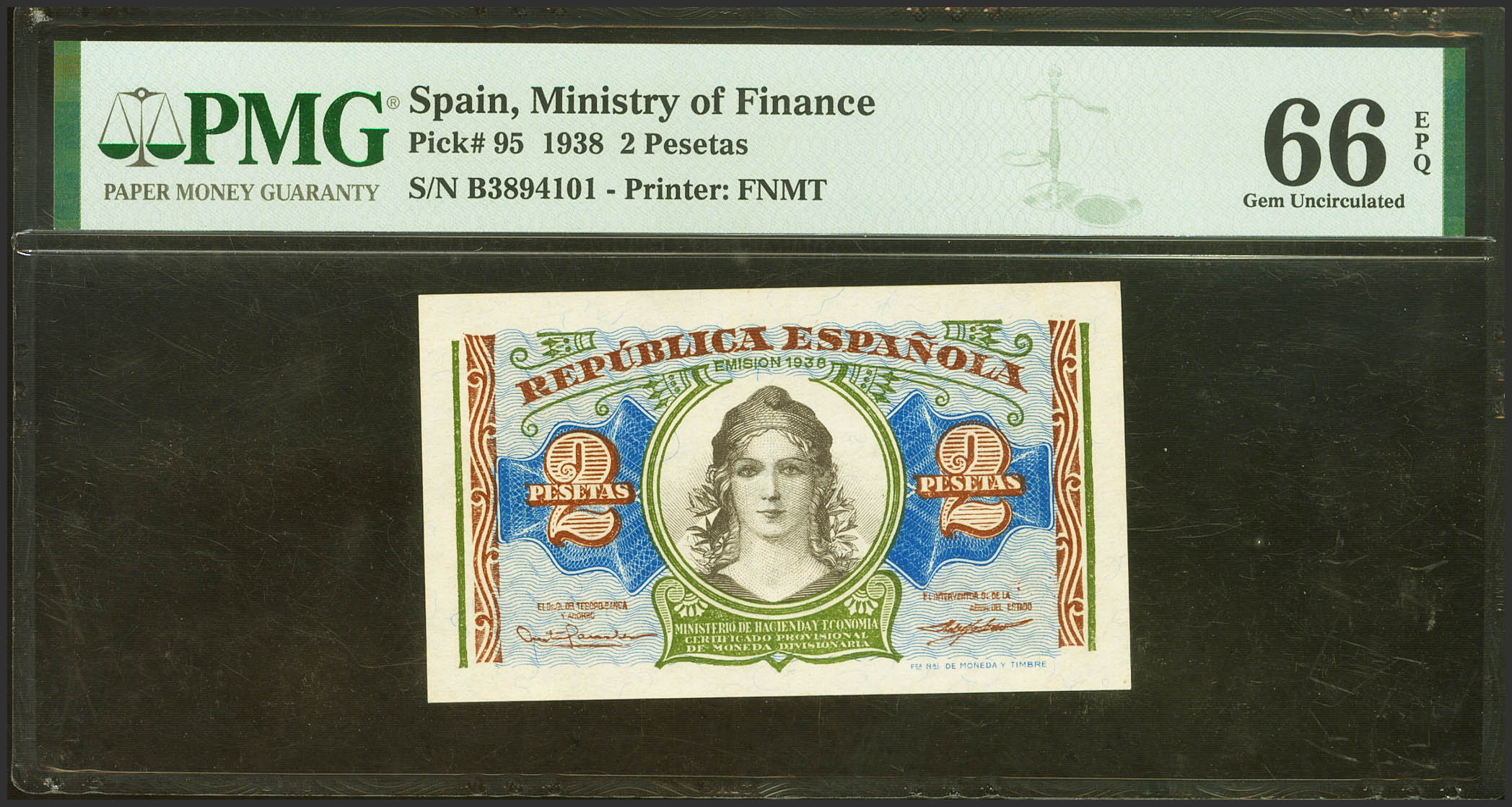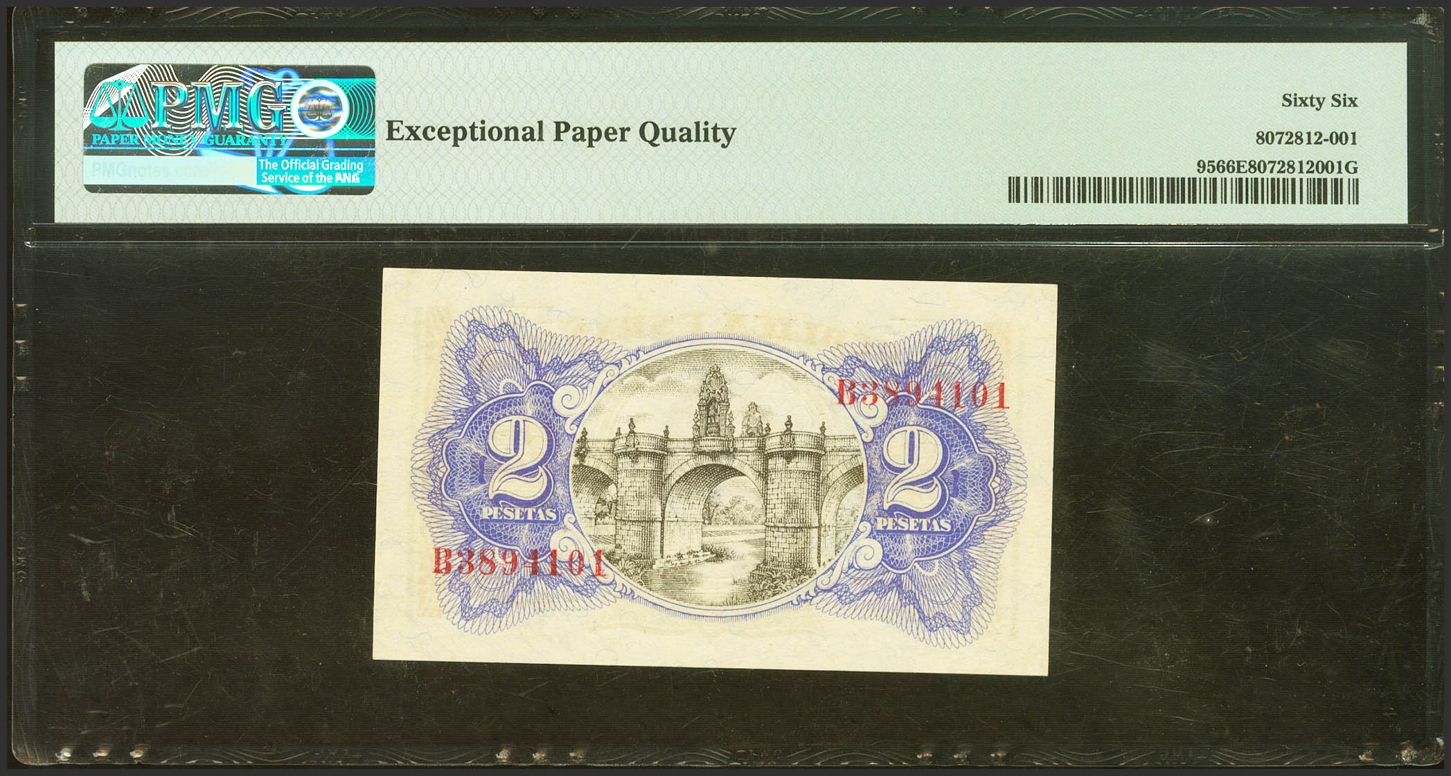 2 Pesetas. 1938. Ministerio de Hacienda. Serie B. (Edifil 2021: 393, Pick: 95). Apresto original. SC. Encapsulado PMG66EPQ.
