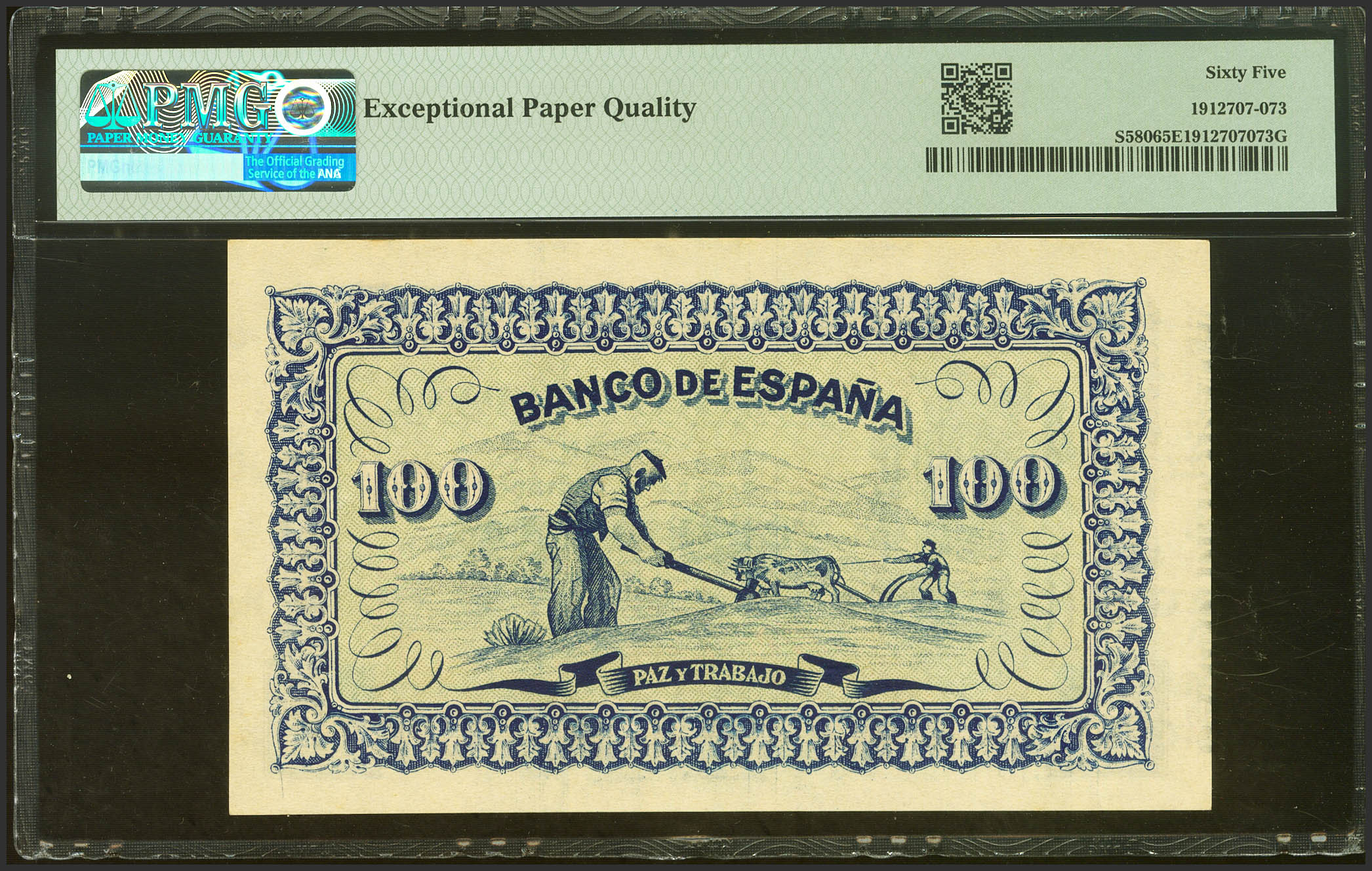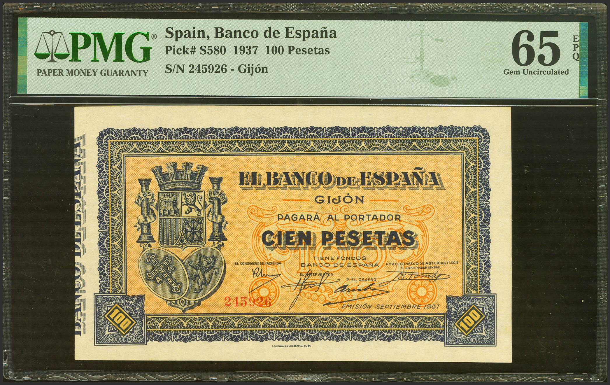 100 Pesetas. Septiembre 1937. Sucursal de Gijón. Sin serie. (Edifil 2021: 399, Pick: S580). Inusual en esta calidad, apresto original. SC. Encapsulado PMG65EPQ.