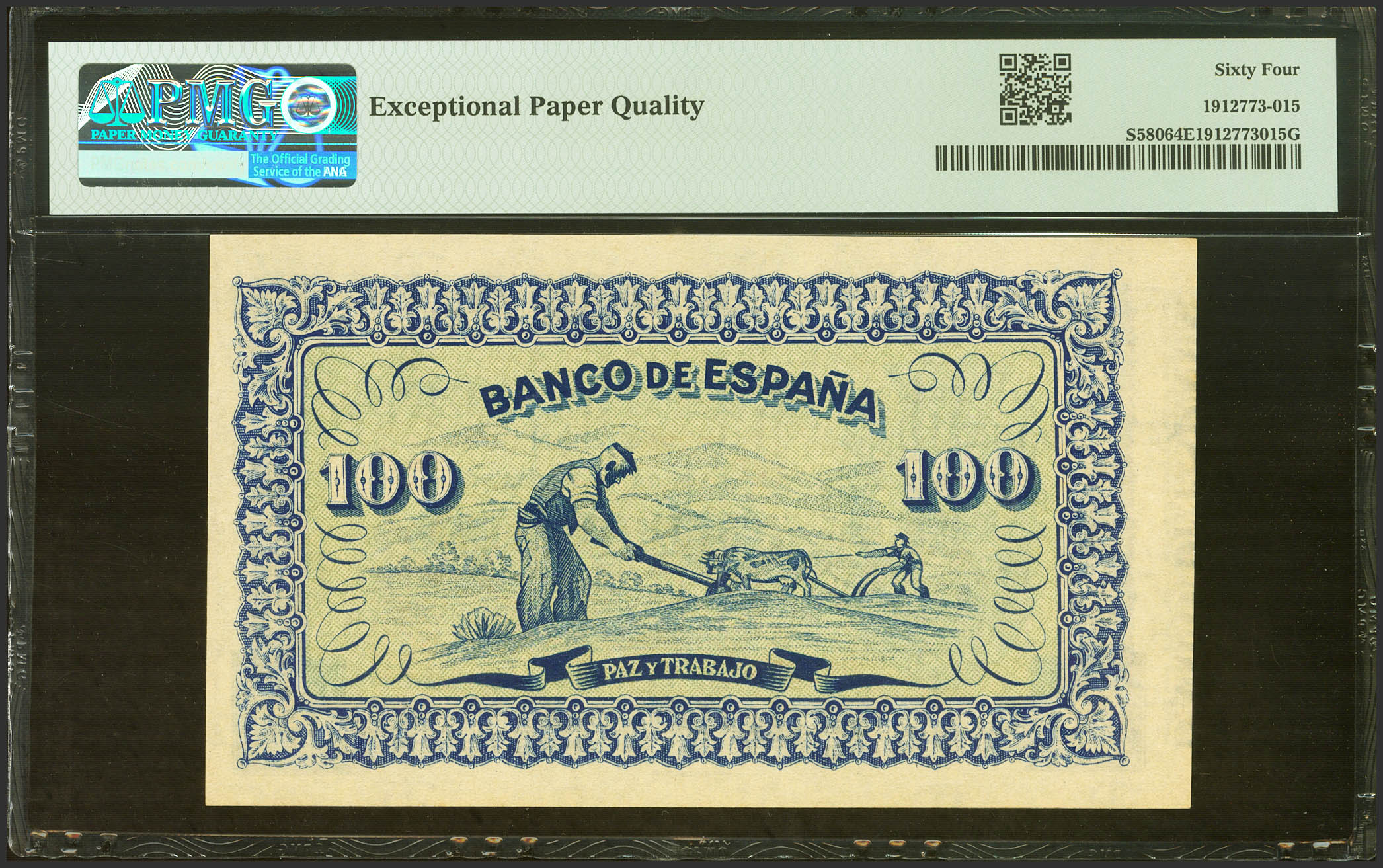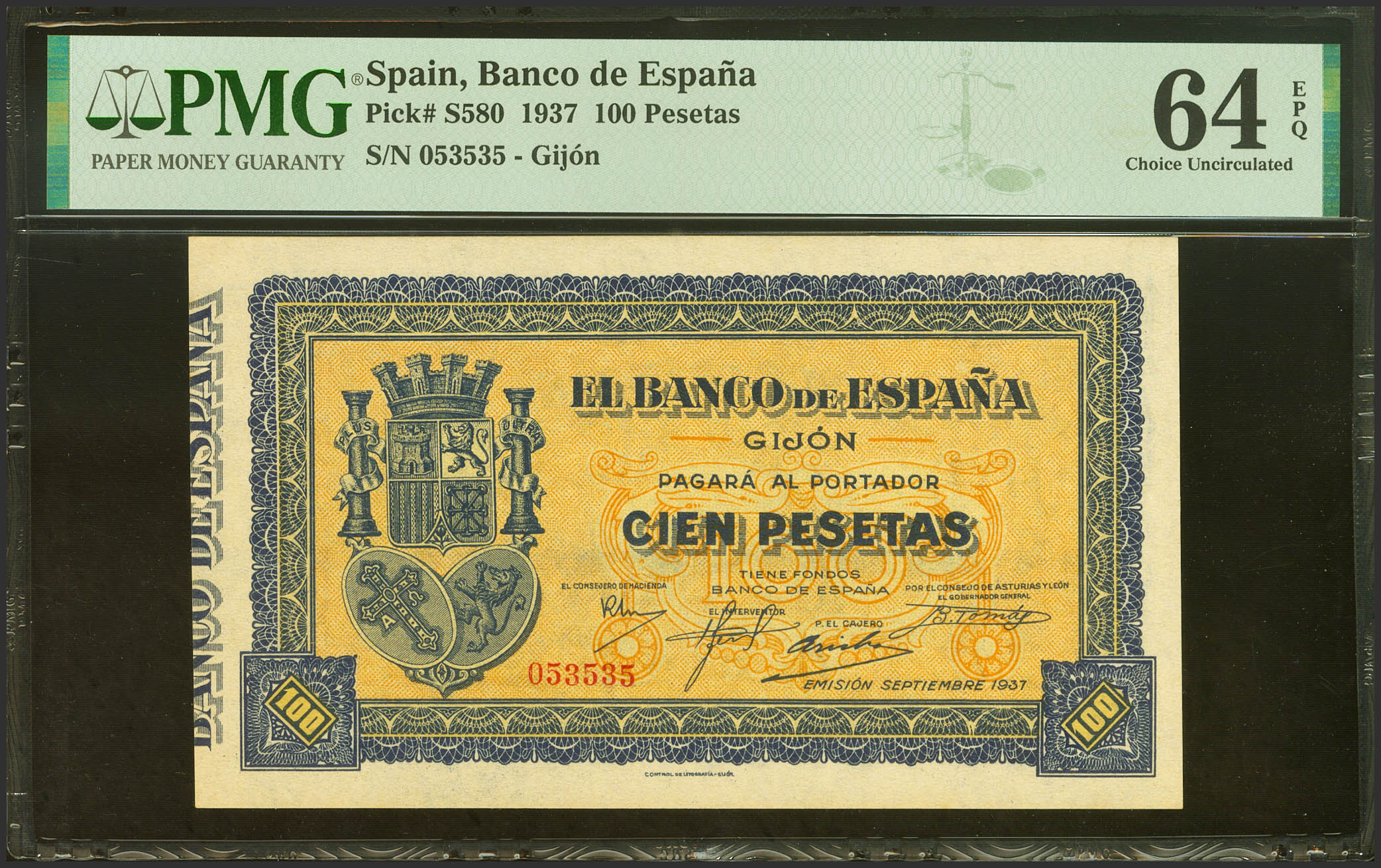 100 Pesetas. Septiembre 1937. Sin serie. (Edifil 2021: 399, Pick: S580). Inusual en esta calidad, apresto original. SC. Encapsulado PMG64EPQ.