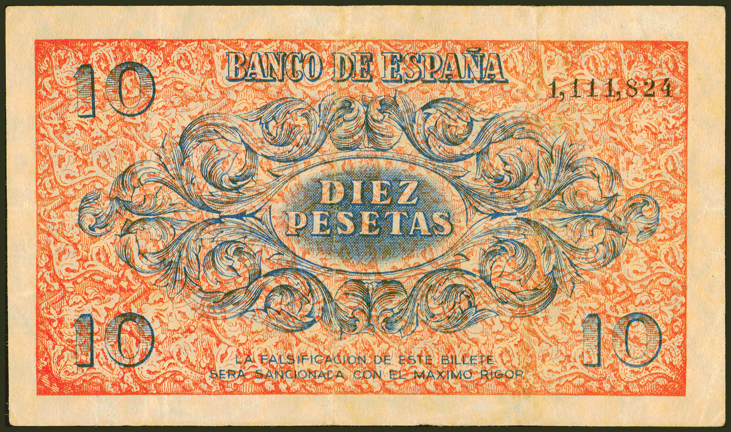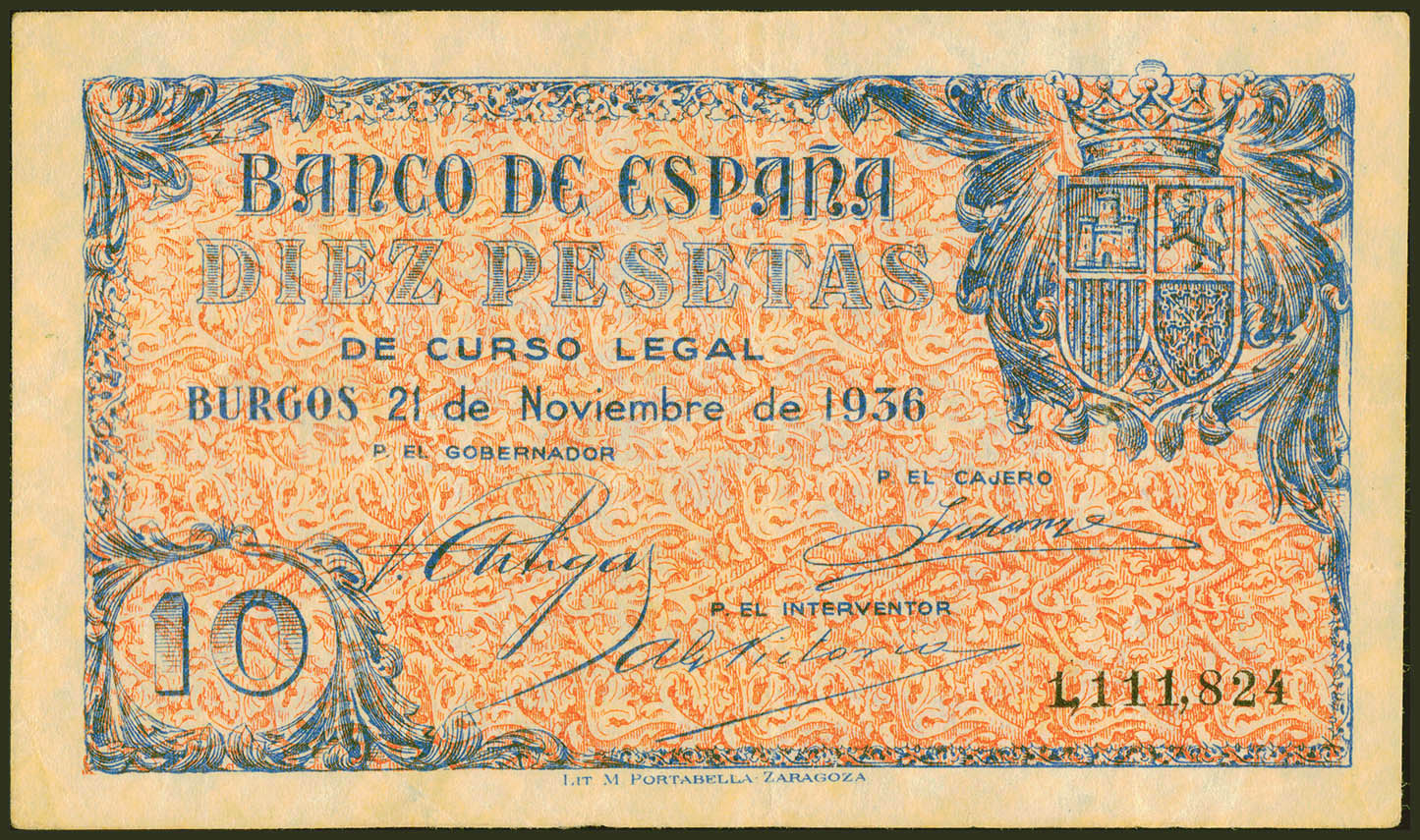 10 Pesetas. 21 de Noviembre de 1936. Sin serie. (Edifil 2021: 418). Inusual, especialmente sin ninguna reparación. MBC.