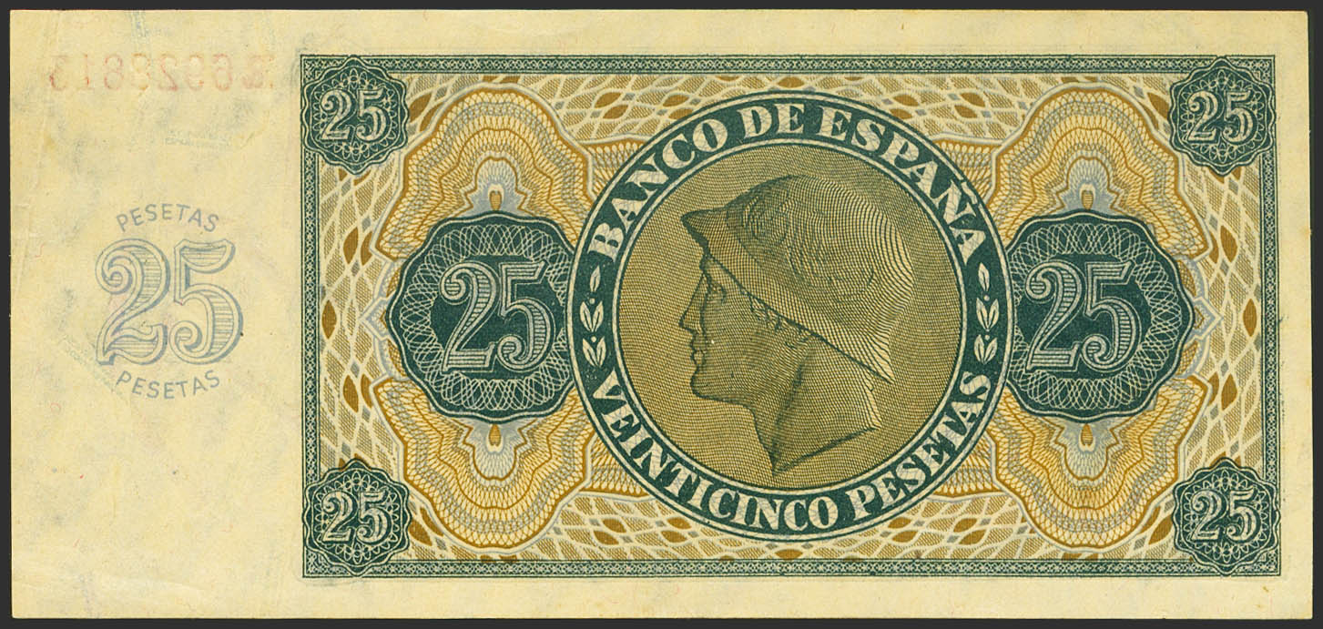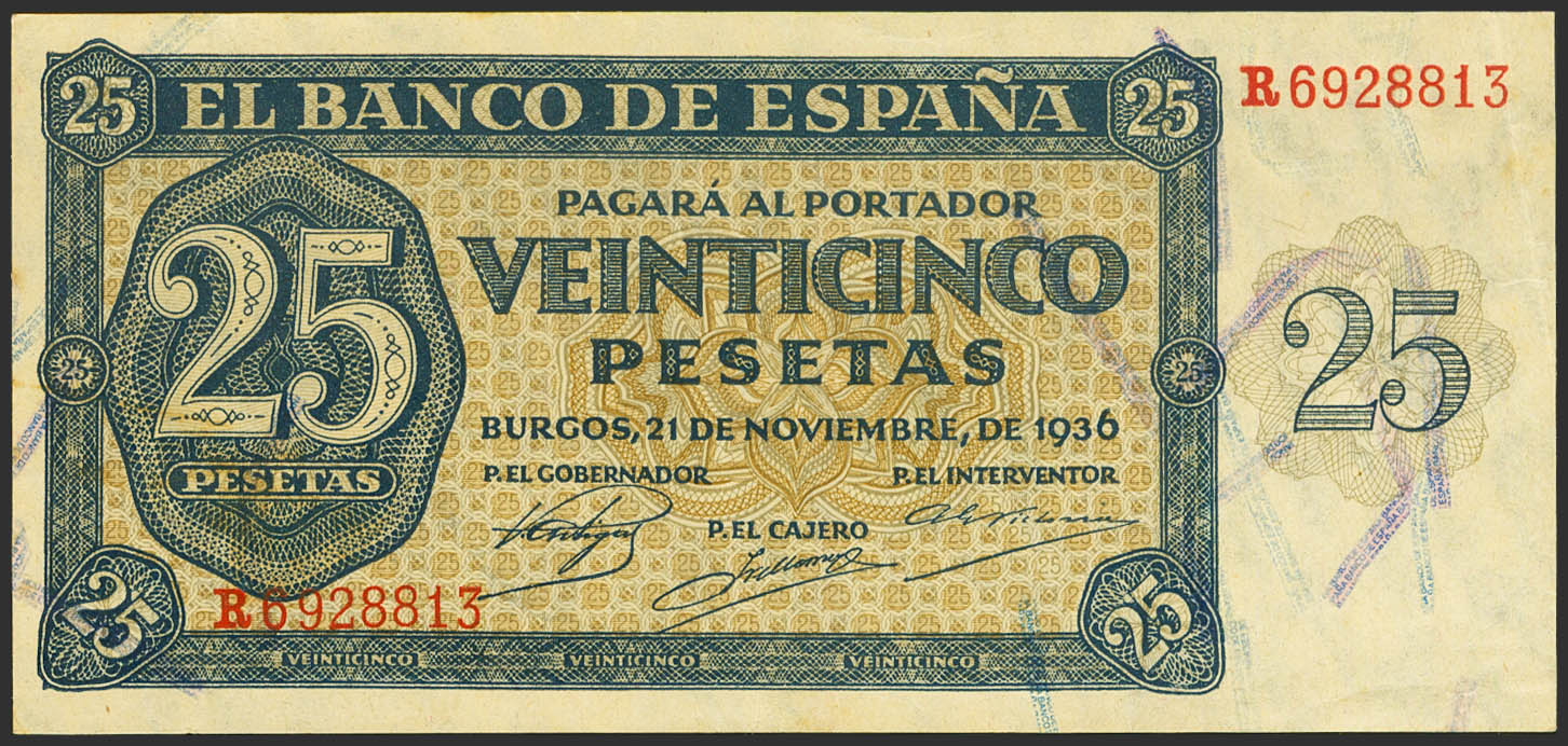 25 Pesetas. 21 de Noviembre de 1936. Serie R. (Edifil 2021: 419a). Conserva gran parte de su apresto orginal. EBC+.