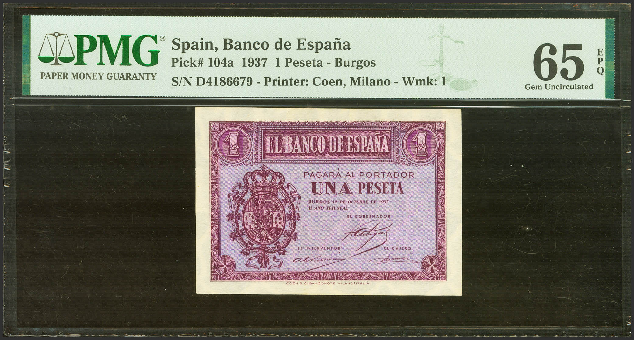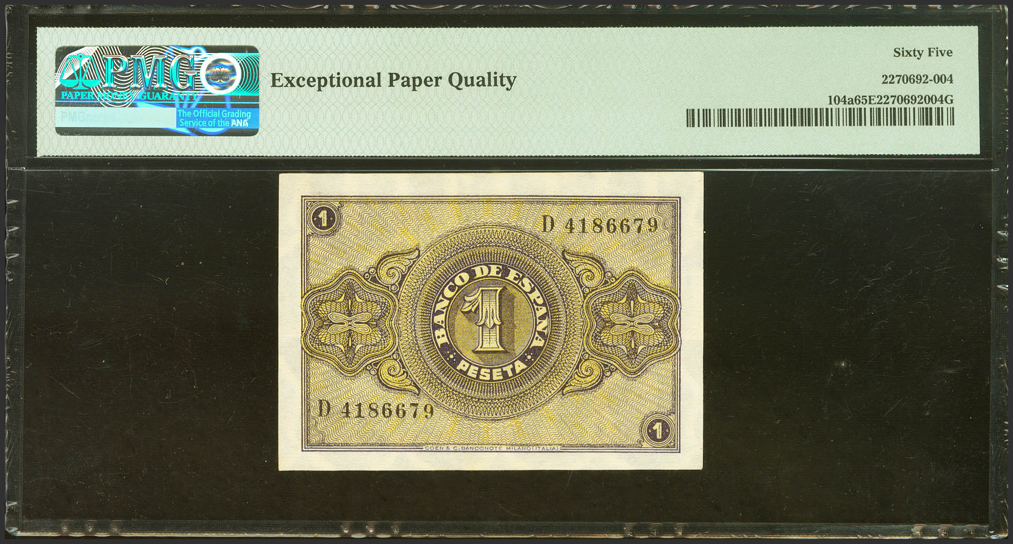1 Peseta. 12 de Octubre de 1937. Serie D. (Edifil 2021: 425a, Pick: 104a). Apresto original. Encapsulado PMG65EPQ.