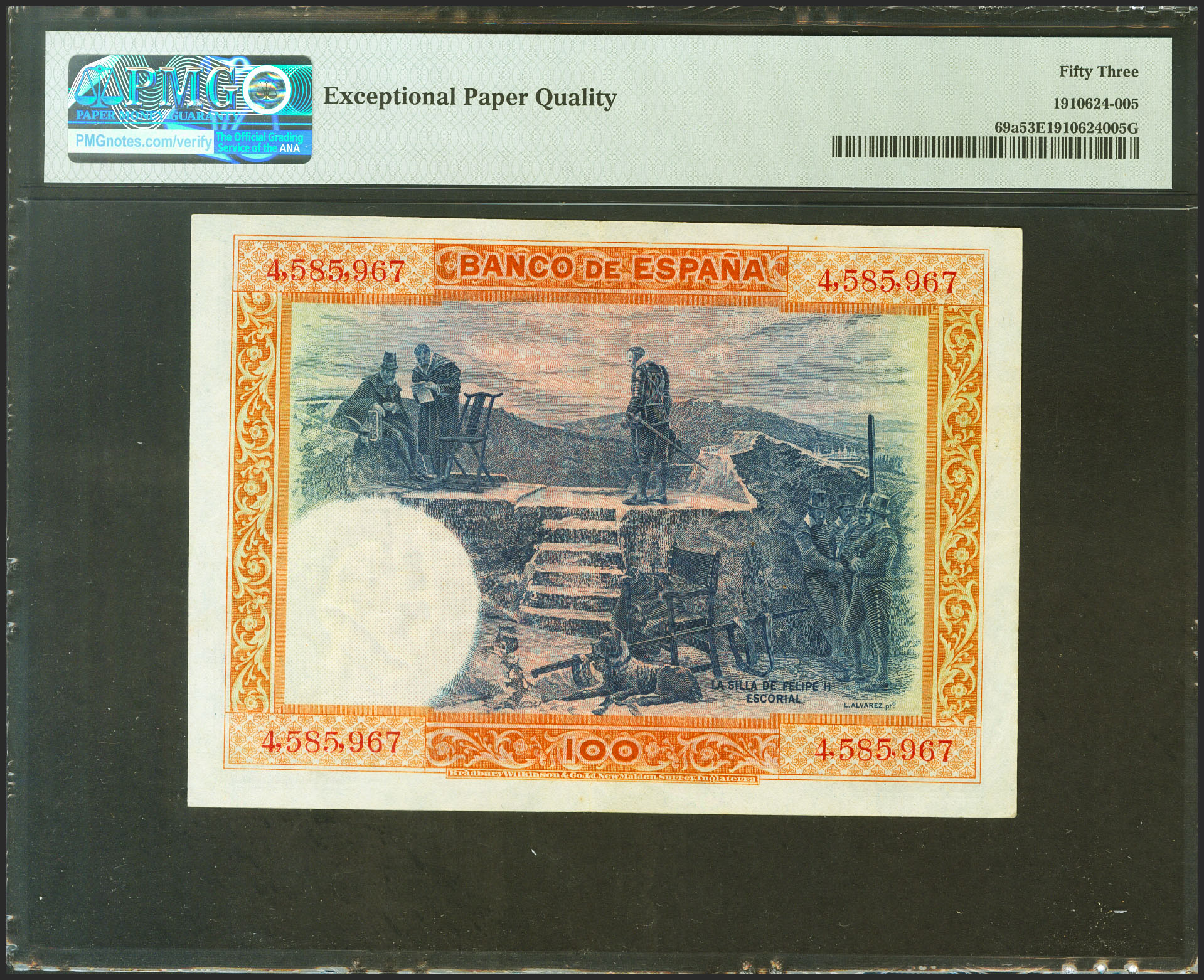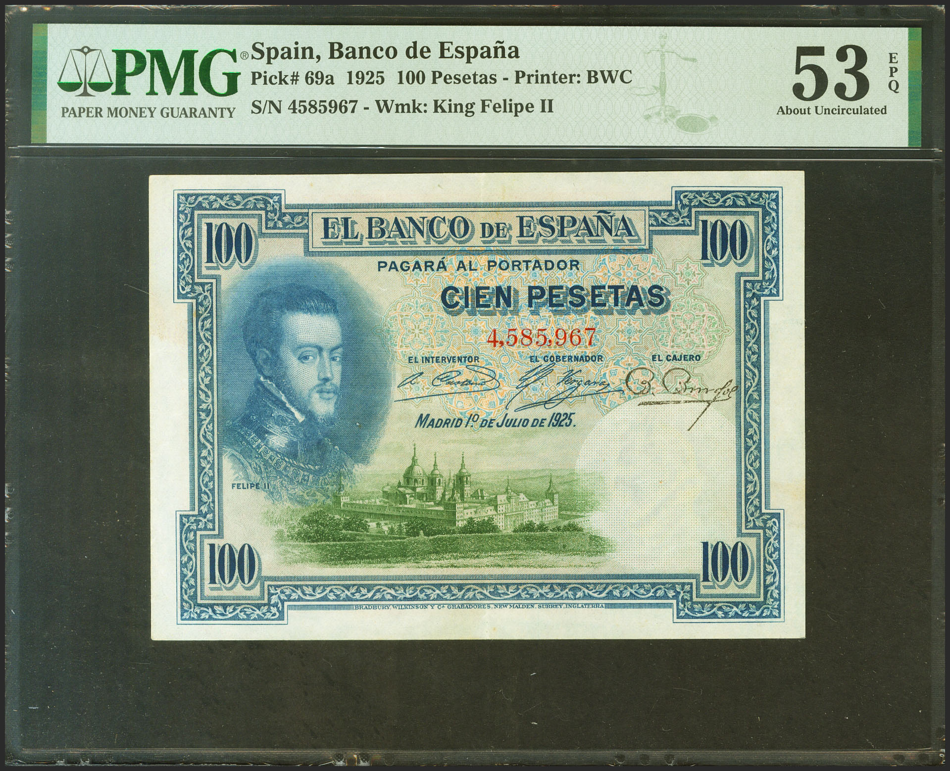 100 Pesetas. 1 de Julio de 1925. Sin serie. (Edifil 2021: 323, Pick: 69a). Raro en esta excepcional calidad, apresto original. EBC+. Encapsulado PMG53EPQ.