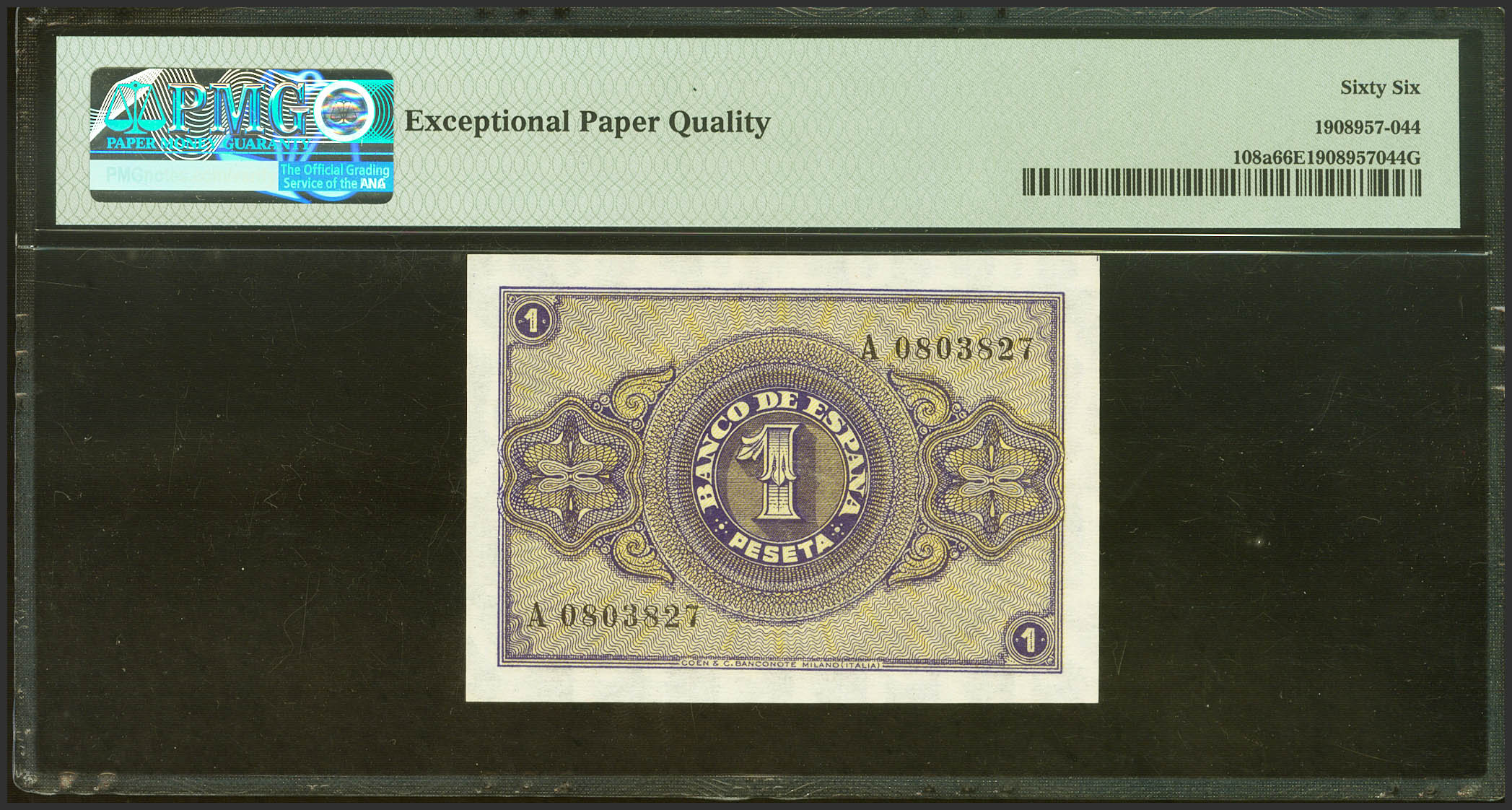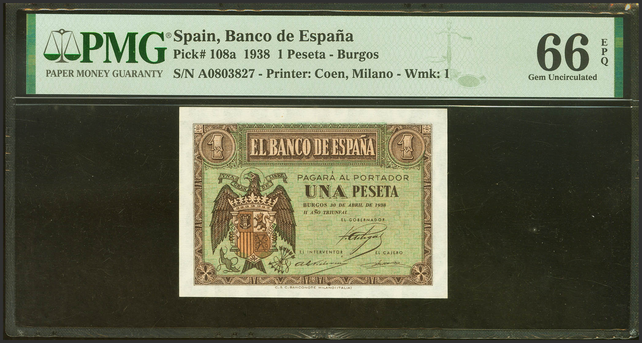 1 Pesetas. 30 de Abril de 1938. Serie A. (Edifil 2021: 428, Pick: 108a). Inusual en esta calidad, apresto original. SC. Encapsulado PMG66EPQ.