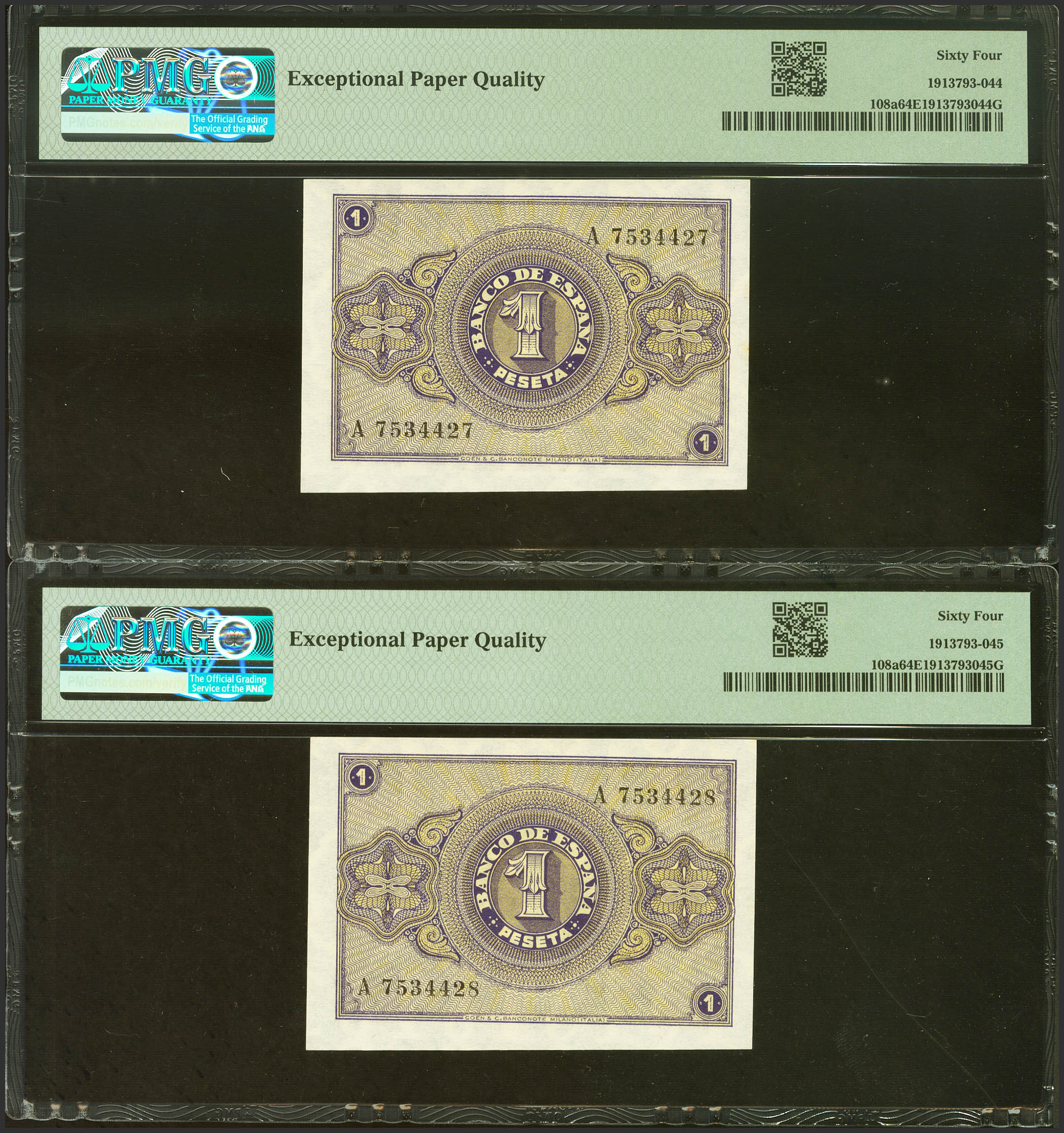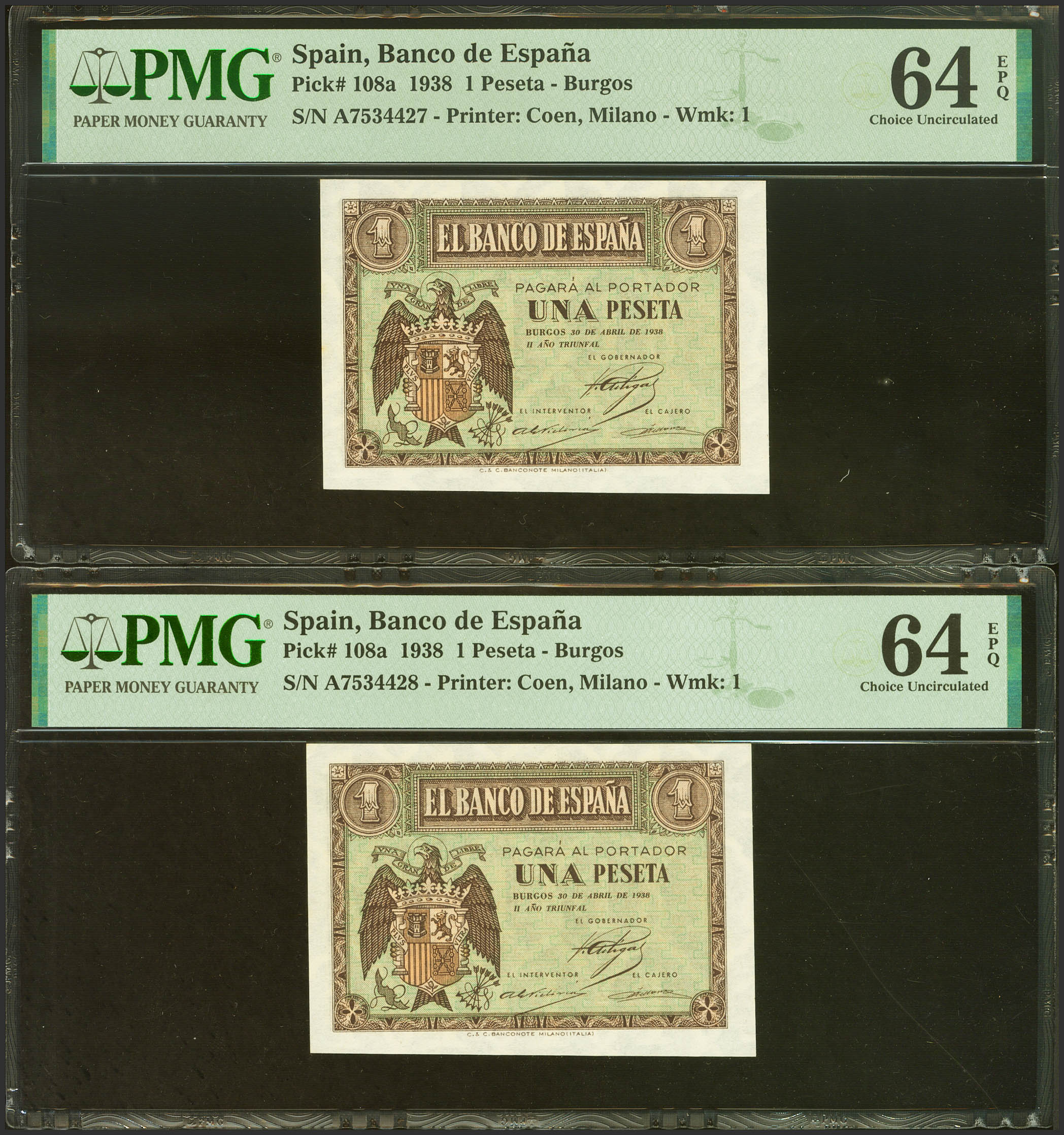 1 Peseta. 30 de Abril de 1938. Pareja correlativa. Serie A. (Edifil 2021: 428, Pick: 108a). Apresto original. SC. Encapsulados PMG64EPQ, ambos.