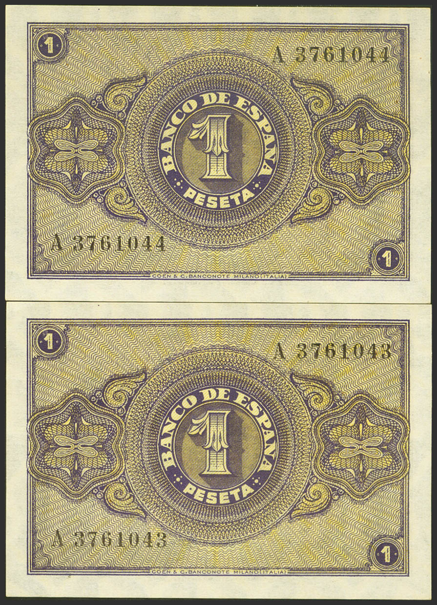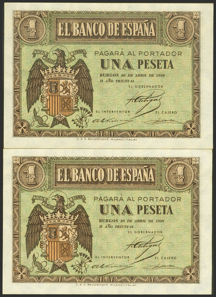 1 Peseta. 30 de Abril de 1938. Pareja correlativa. Serie A. (Edifil 2021: 428). Apresto original. SC.
