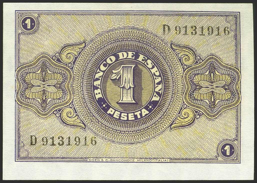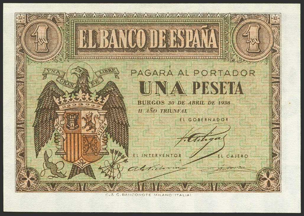 1 Peseta. 30 de Abril de 1938. Serie D. (Edifil 2021: 428a). Apresto original. SC-.