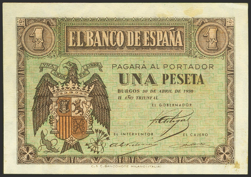 1 Peseta. 30 de Abril de 1938. Serie D. (Edifil 2021: 428a). Apresto original y manchitas del tiempo. SC--.