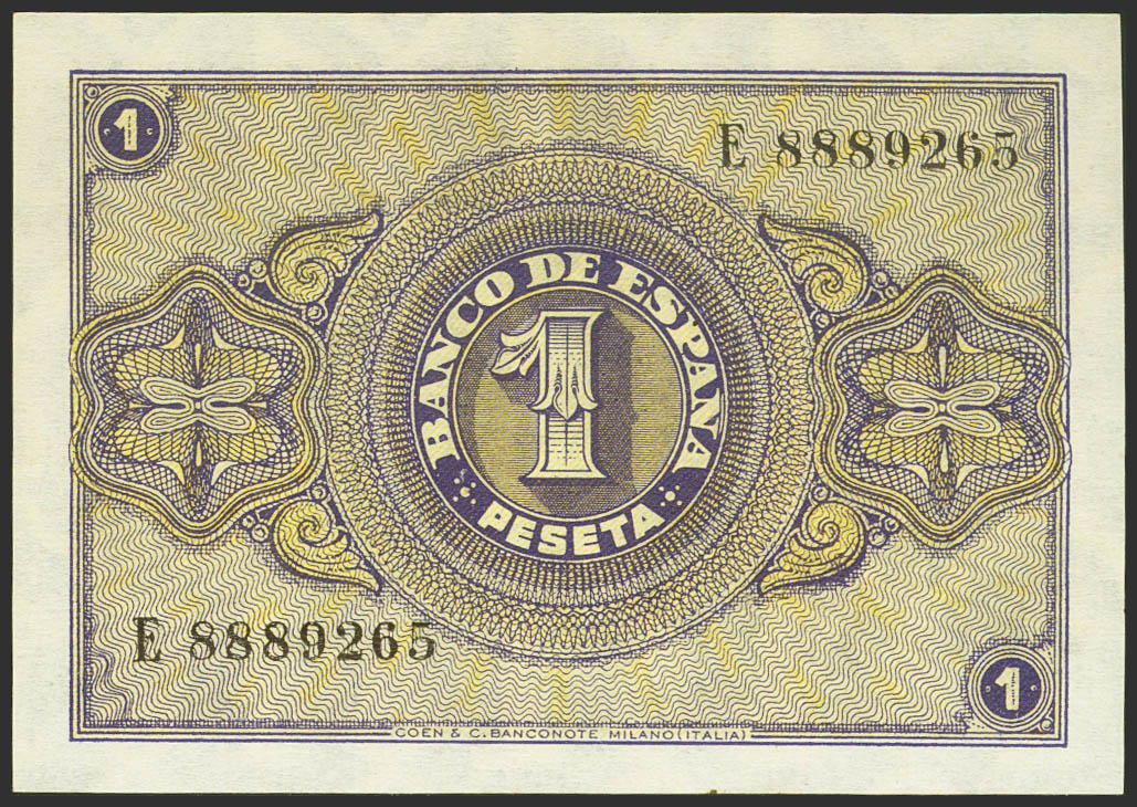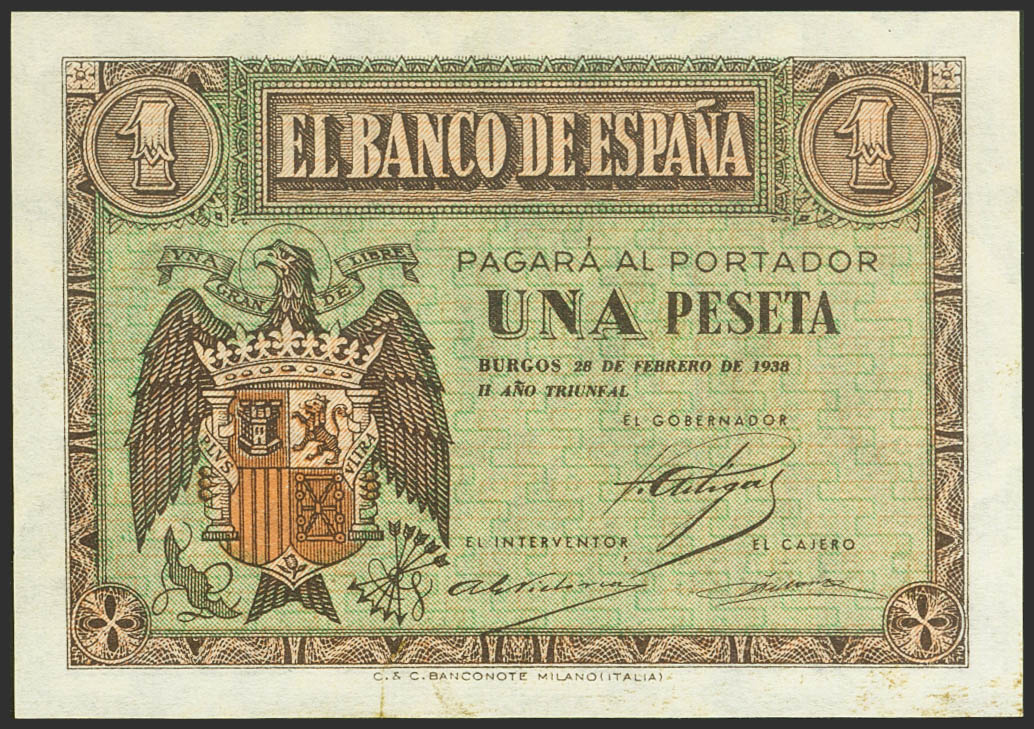 1 Peseta. 30 de Abril de 1938. Serie E. (Edifil 2021: 428a). Apresto original y manchitas del tiempo. SC-.