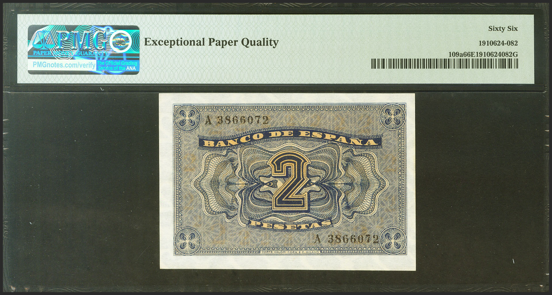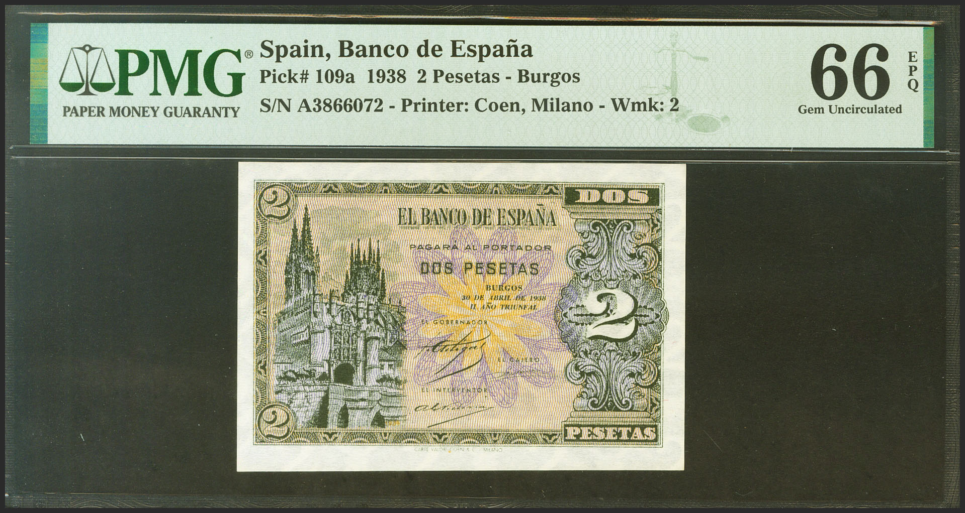 2 Pesetas. 30 de Abril de 1938. Serie A. (Edifil 2021: 429, Pick: 109a). Raro en esta excepcional calidad, apresto original. SC. Encapsulado PMG66EPQ.