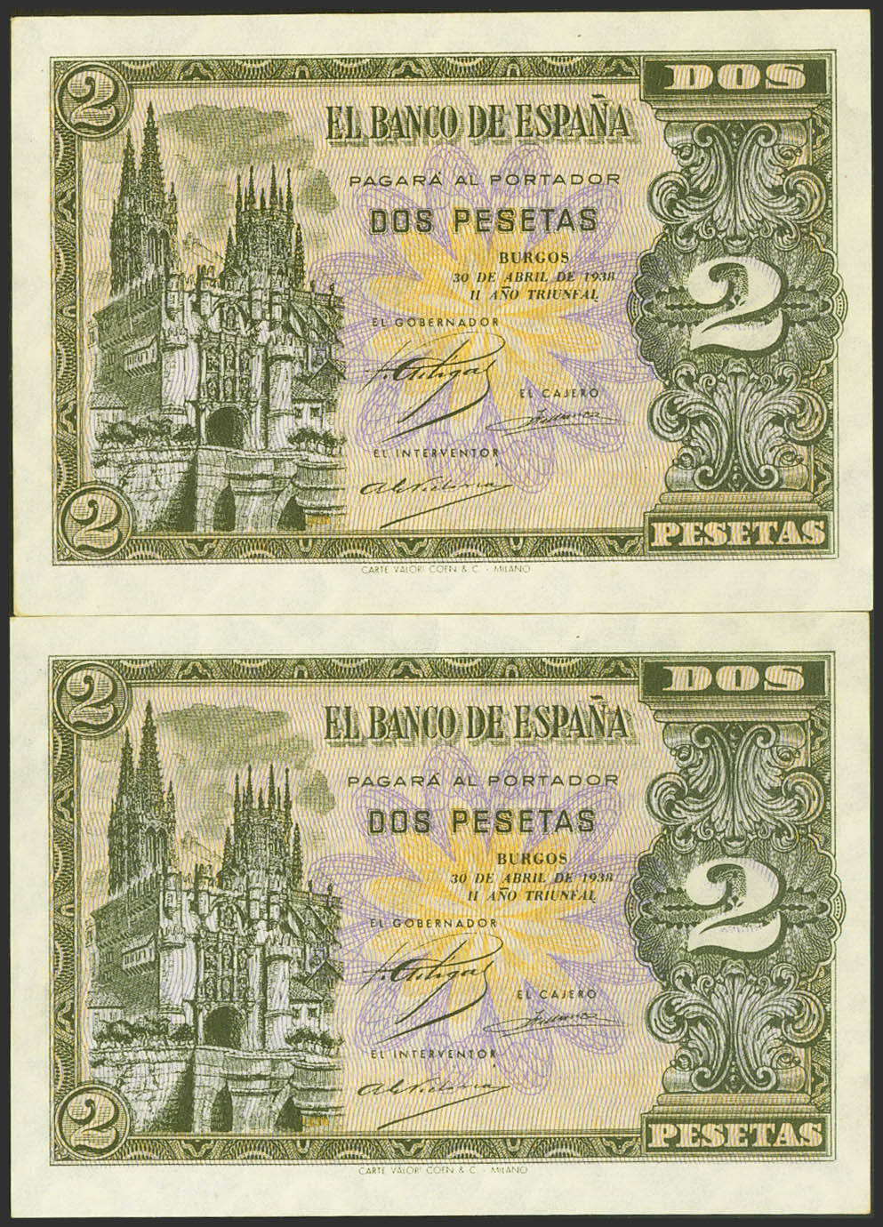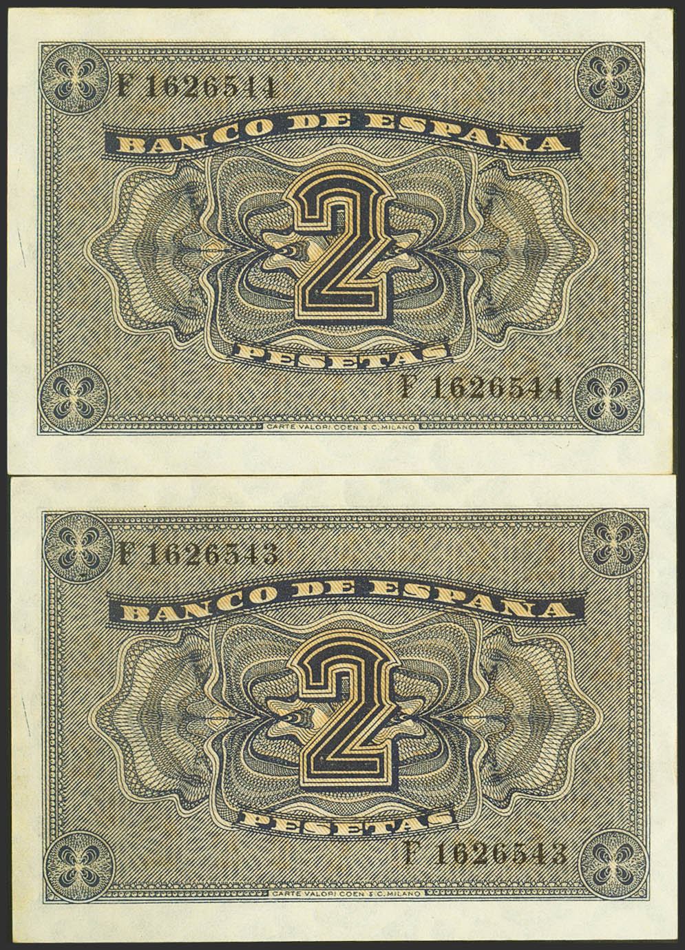 2 Pesetas. 30 de Abril de 1938. Pareja correlativa. Serie F. (Edifil 2023: 429a). Conserva todo su apresto original. SC.