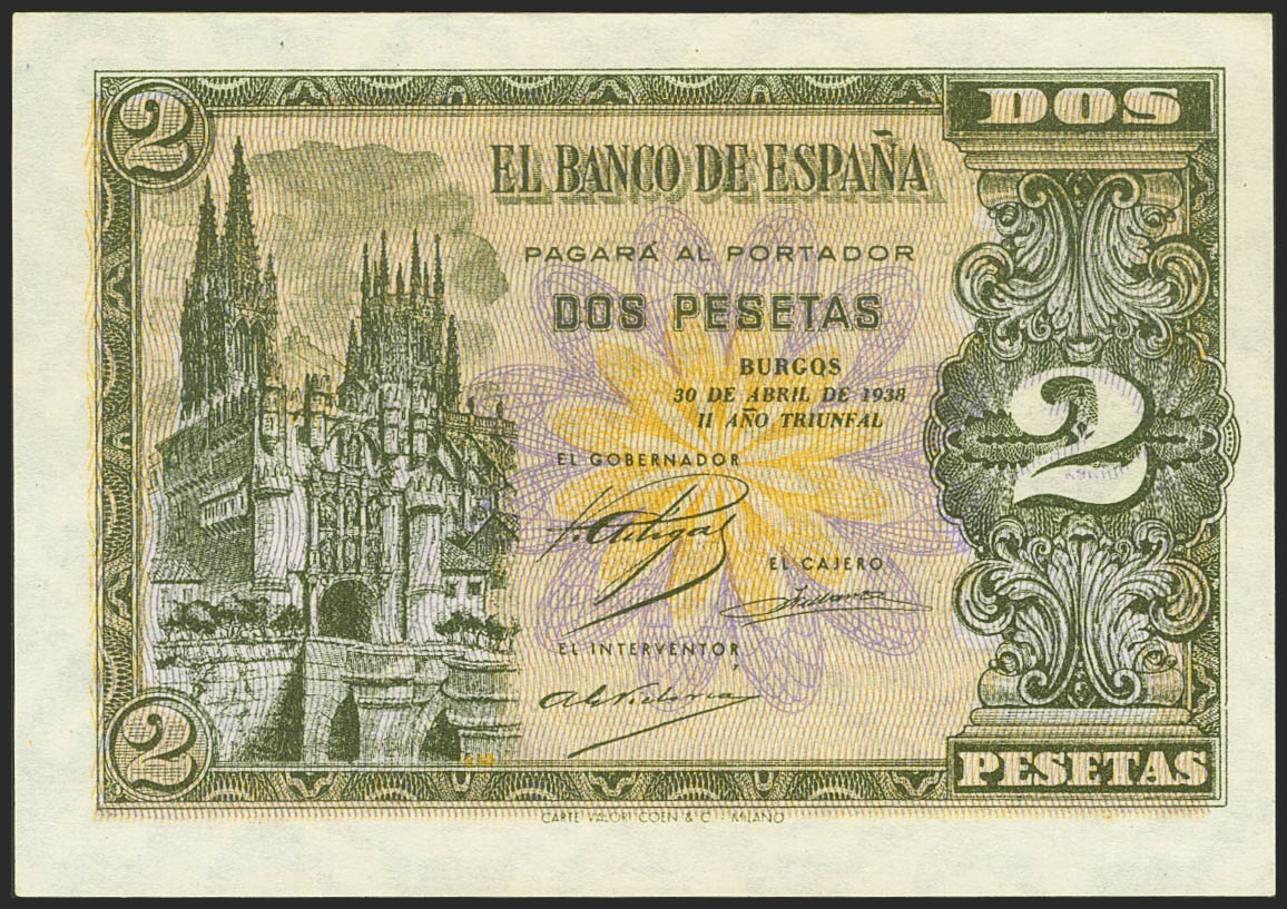 2 Pesetas. 30 de Abril de 1938. Serie L. (Edifil 2021: 429a). Conserva todo su apresto original. SC.