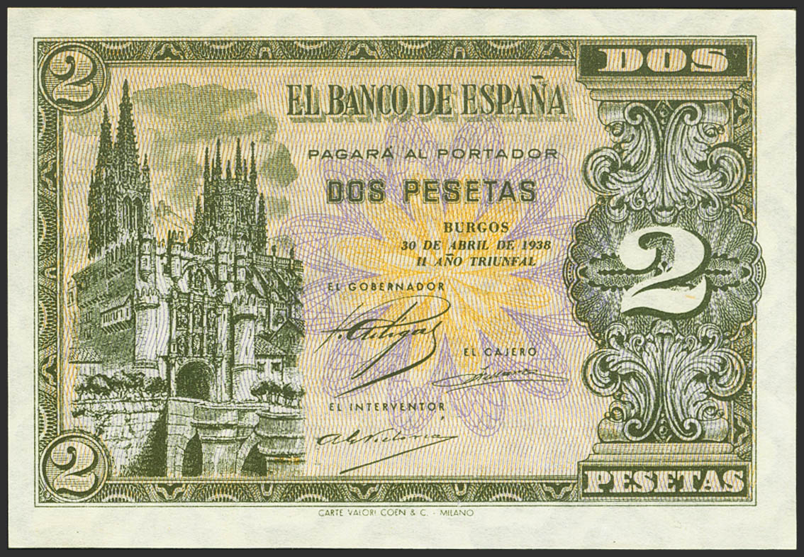 2 Pesetas. 30 de Abril de 1938. Serie M. (Edifil 2021: 429a). Apresto original. SC.