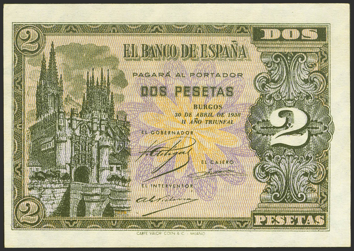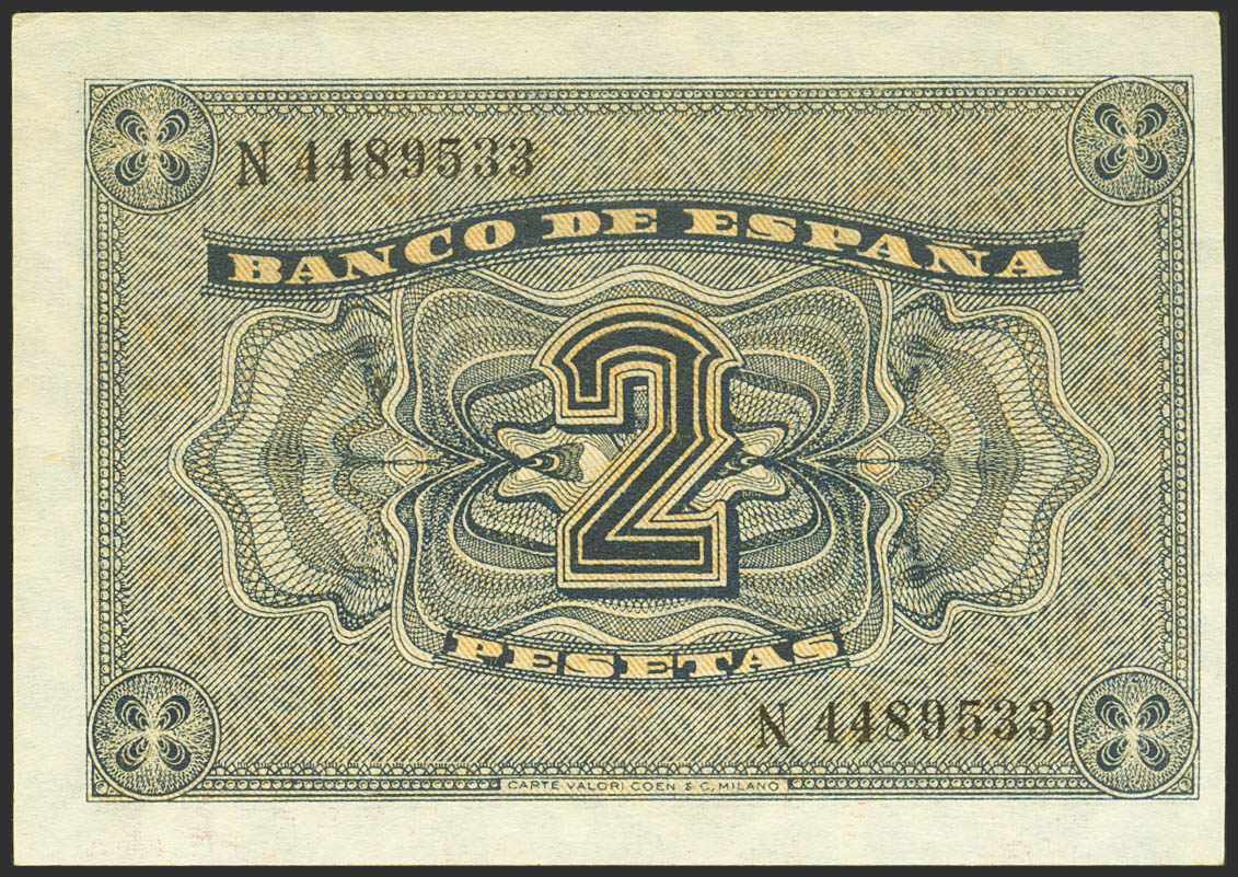 2 Pesetas. 30 de Abril de 1938. Serie N, última serie emitida. (Edifil 2021: 429a). Apresto original. SC.