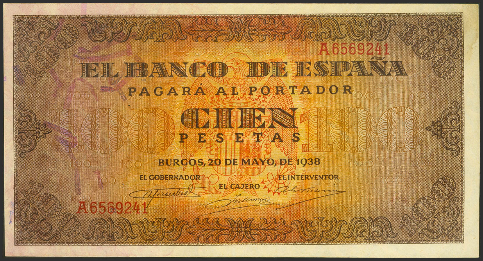 100 Pesetas. 20 de Mayo de 1938. Serie A. (Edifil 2021: 432, Pick: 113a). Conserva todo su apresto original, manchita en la esquina superior derecha. SC-.