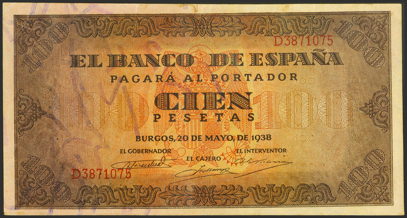 100 Pesetas. 20 de Mayo de 1938. Serie D. (Edifil 2021: 432a). Conserva parte de su apresto original y manchitas del tiempo. EBC+.