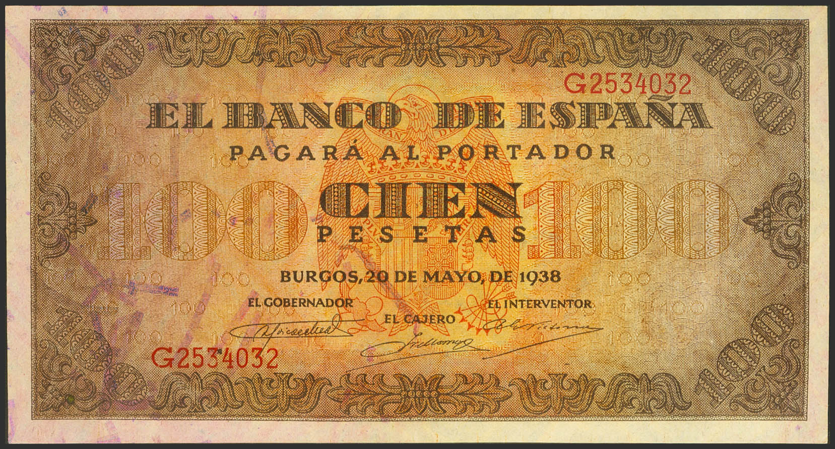 100 Pesetas. 20 de Mayo de 1938. Serie G. (Edifil 2021: 432a). Conserva parte de su apresto original. EBC+.