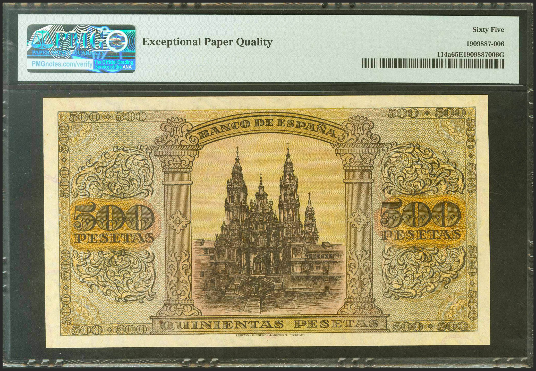 500 Pesetas. 20 de Mayo de 1938. Serie A. (Edifil 2021: 433, Pick: 114a). Raro en esta excepcional calidad, apresto original. SC. Encapsulado PMG65EPQ.