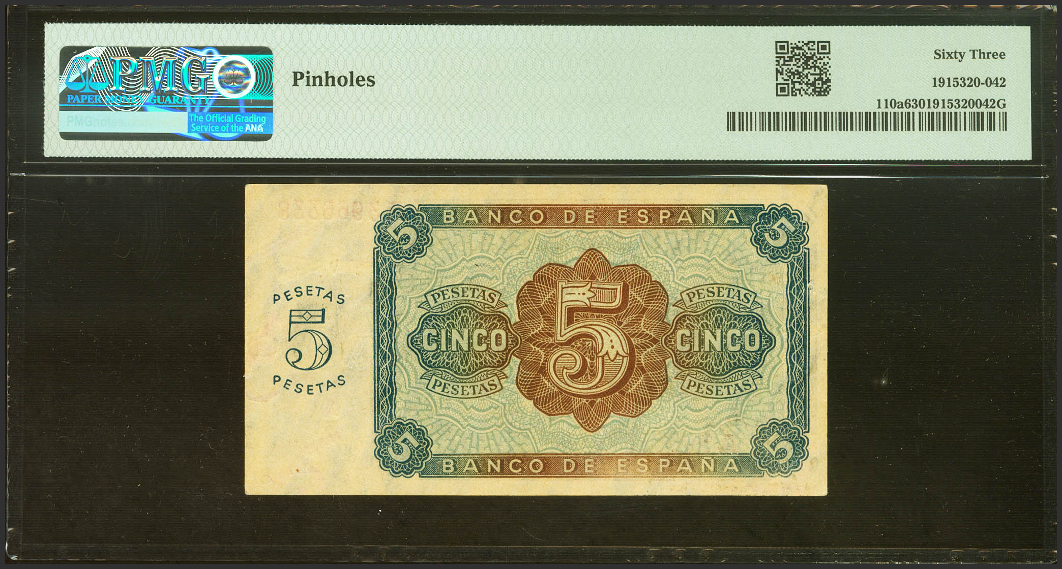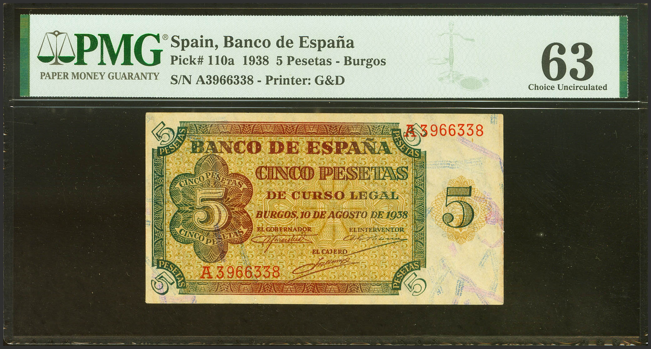 5 Pesetas. 10 de Agosto de 1938. Serie A. (Edifil 2023: 435, Pick: 110a). Puntitos de grapa. SC. Encapsulado PMG63 (pinholes).