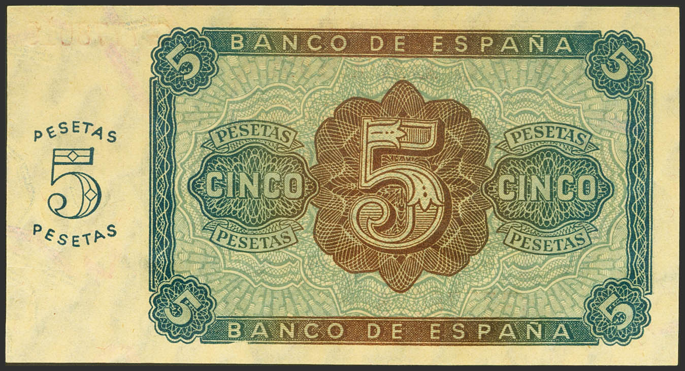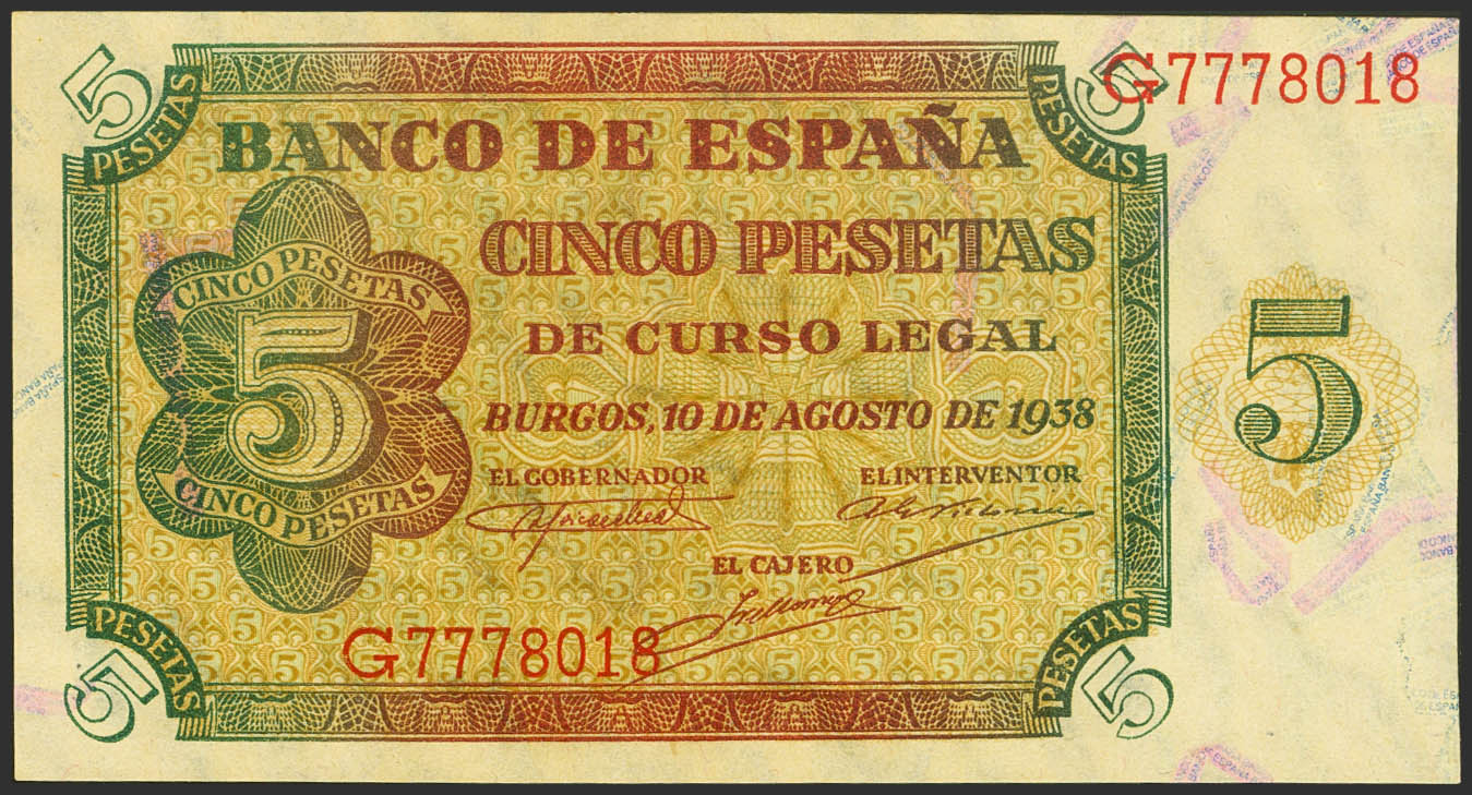 5 Pesetas. 10 de Agosto de 1938. Serie G. (Edifil 2021: 435a). Apresto original. SC.