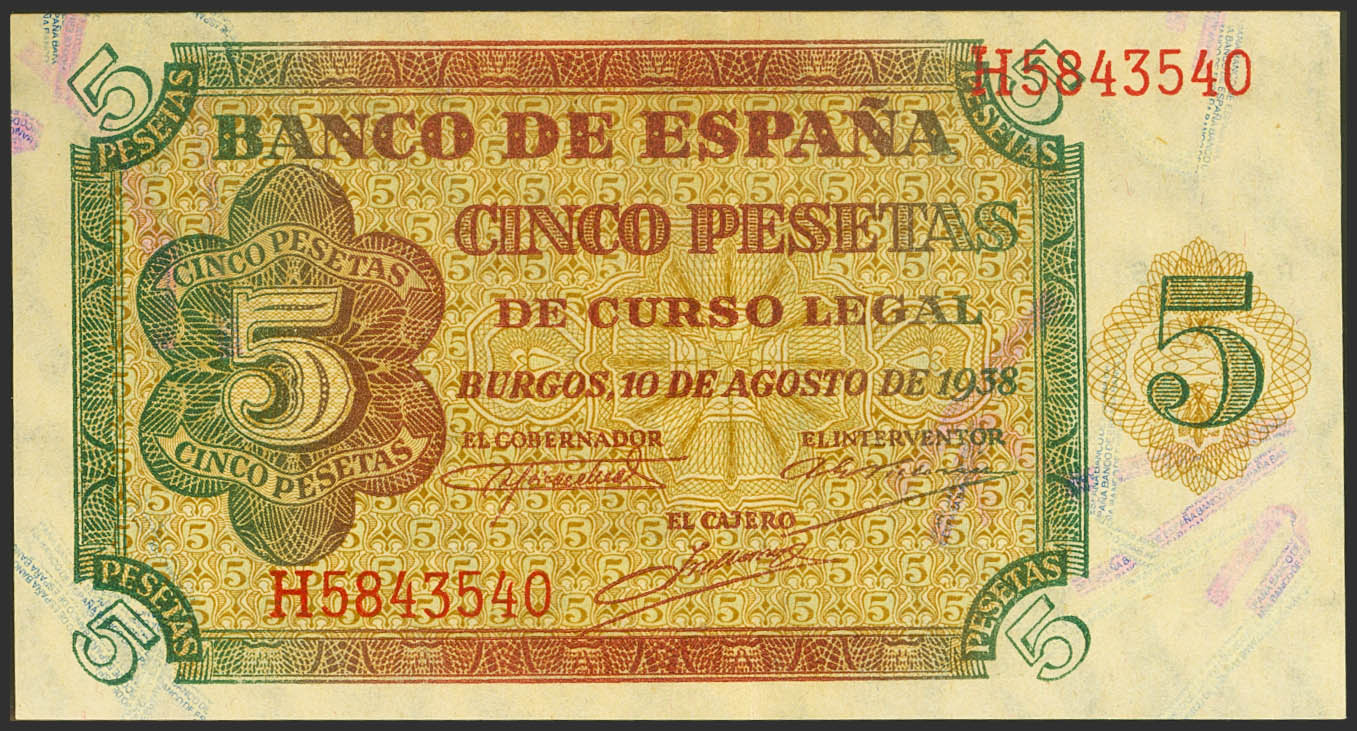 5 Pesetas. 10 de Agosto de 1938. Serie H. (Edifil 2021: 435a). Conserva parte de su apresto original. EBC.