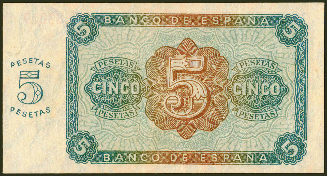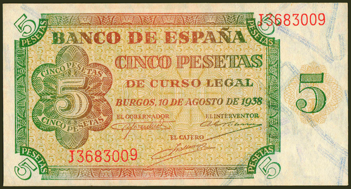 5 Pesetas. 10 de Agosto de 1938. Serie J. (Edifil 2021: 435a). Conserva parte de su apresto original. EBC.