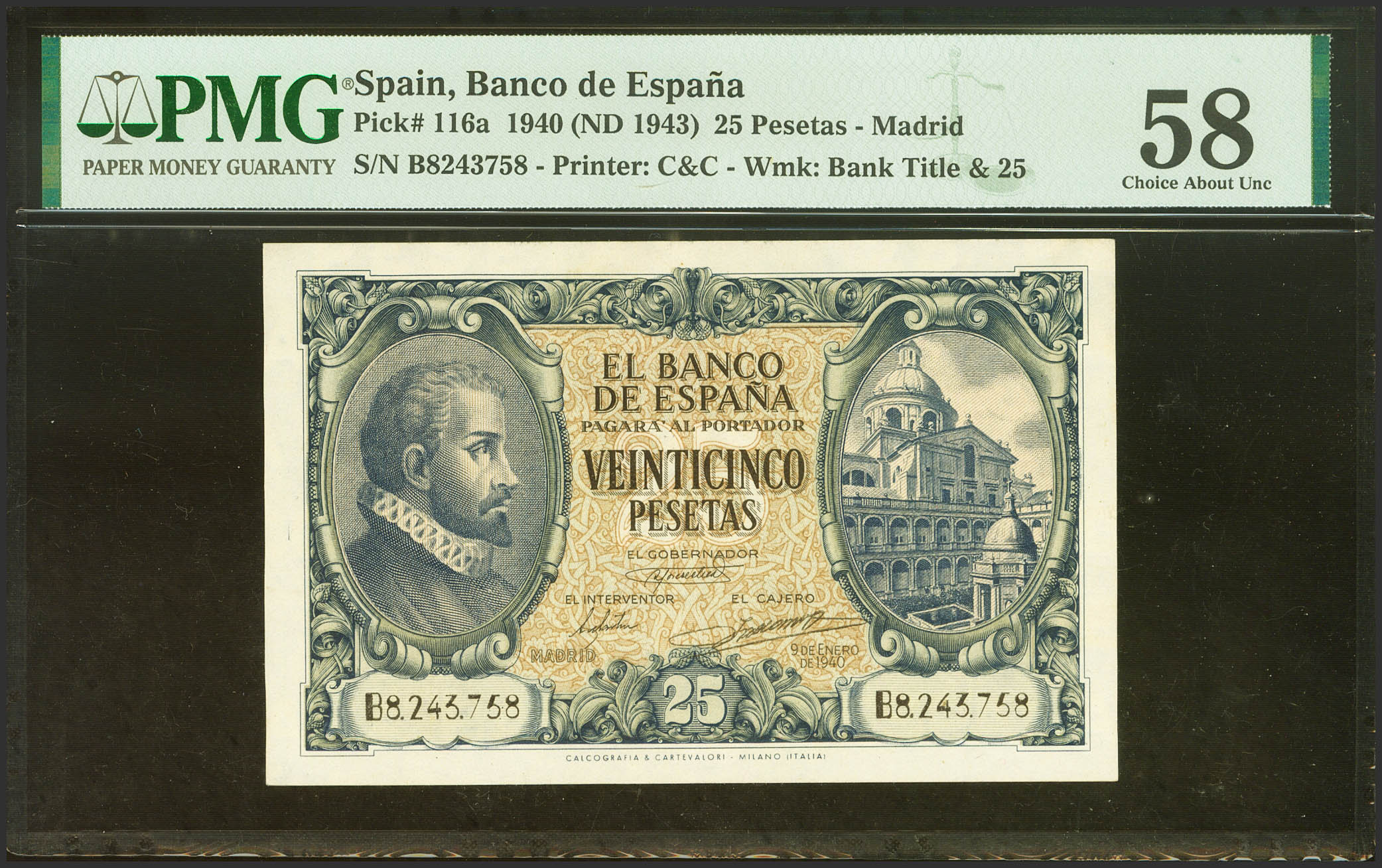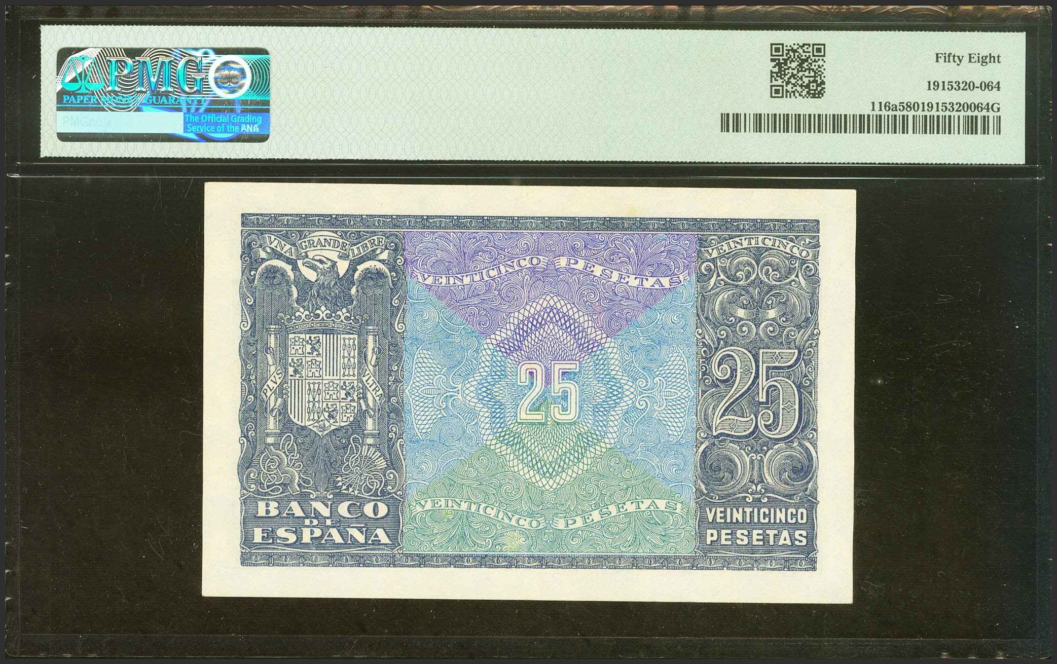 25 Pesetas. 9 de Enero de 1940. Serie B. (Edifil 2023: 436a, Pick: 116a). Inusual. EBC++. Encapsulado PMG58.