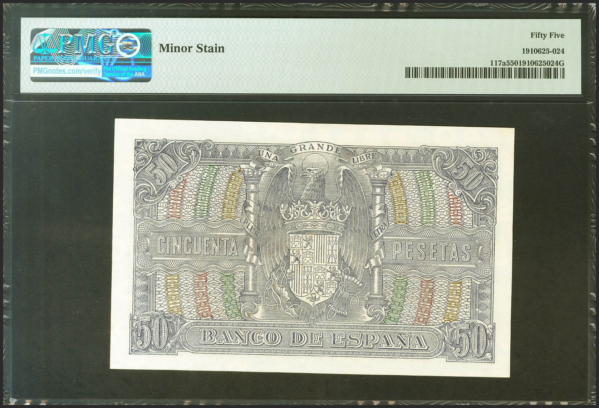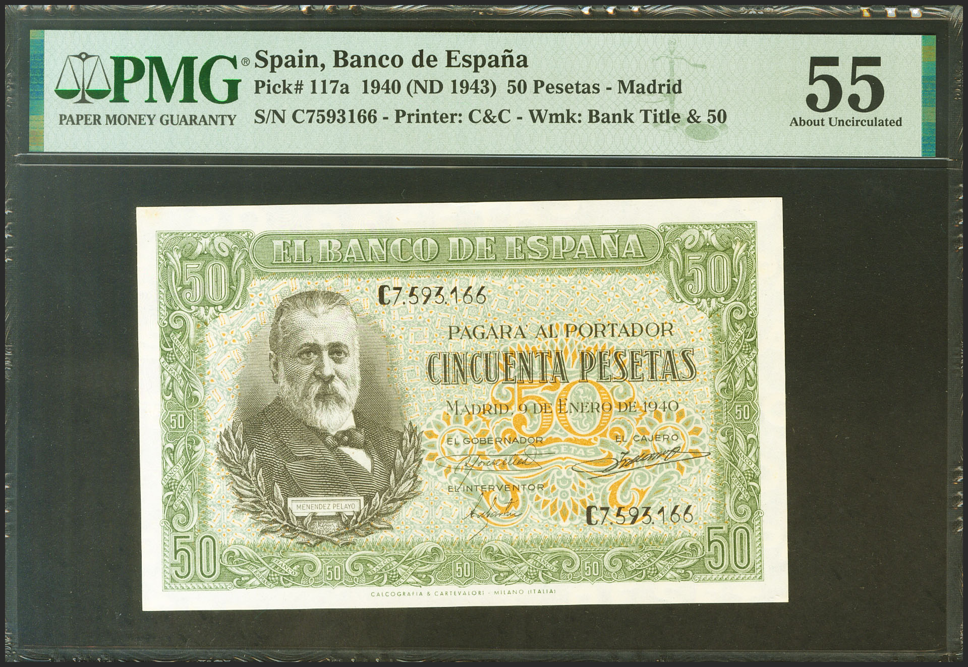 50 Pesetas. 9 de Enero de 1940. Serie C. (Edifil 2021: 437a, Pick: 117a). Inusual. EBC+. Encapsulado PMG55.