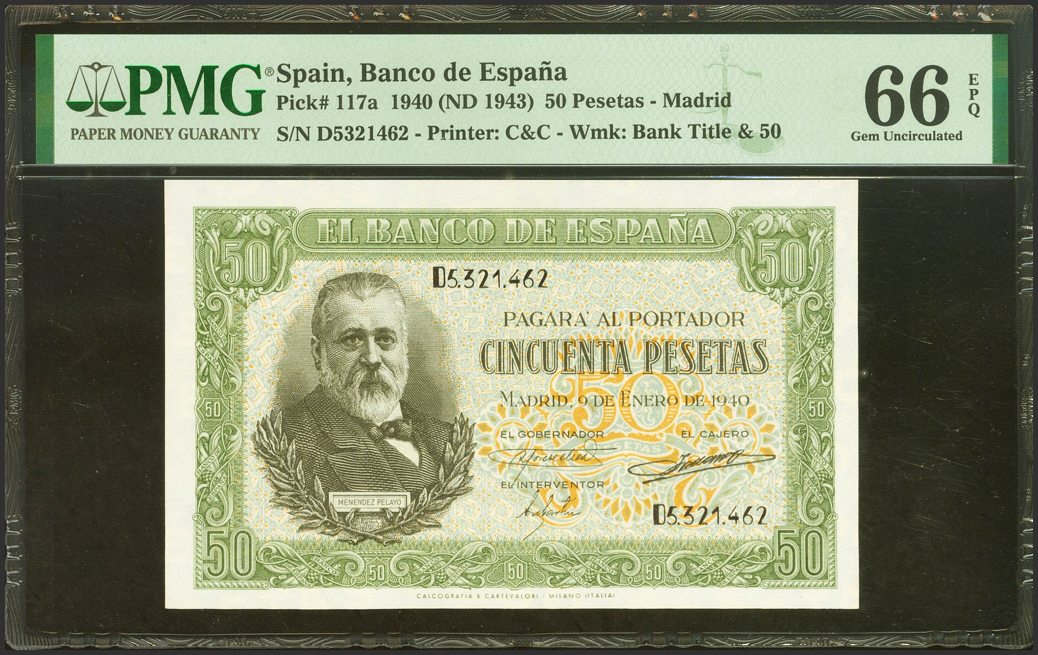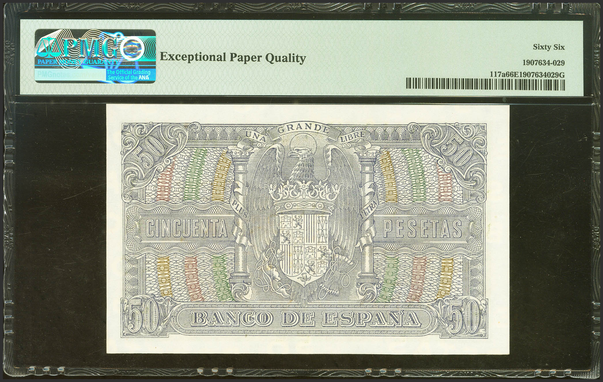 50 Pesetas. 9 de Enero de 1940. Serie D. (Edifil 2023: 437a, Pick: 117a). Inusual en esta calidad, apresto original. Encapsulado PMG66EPQ.