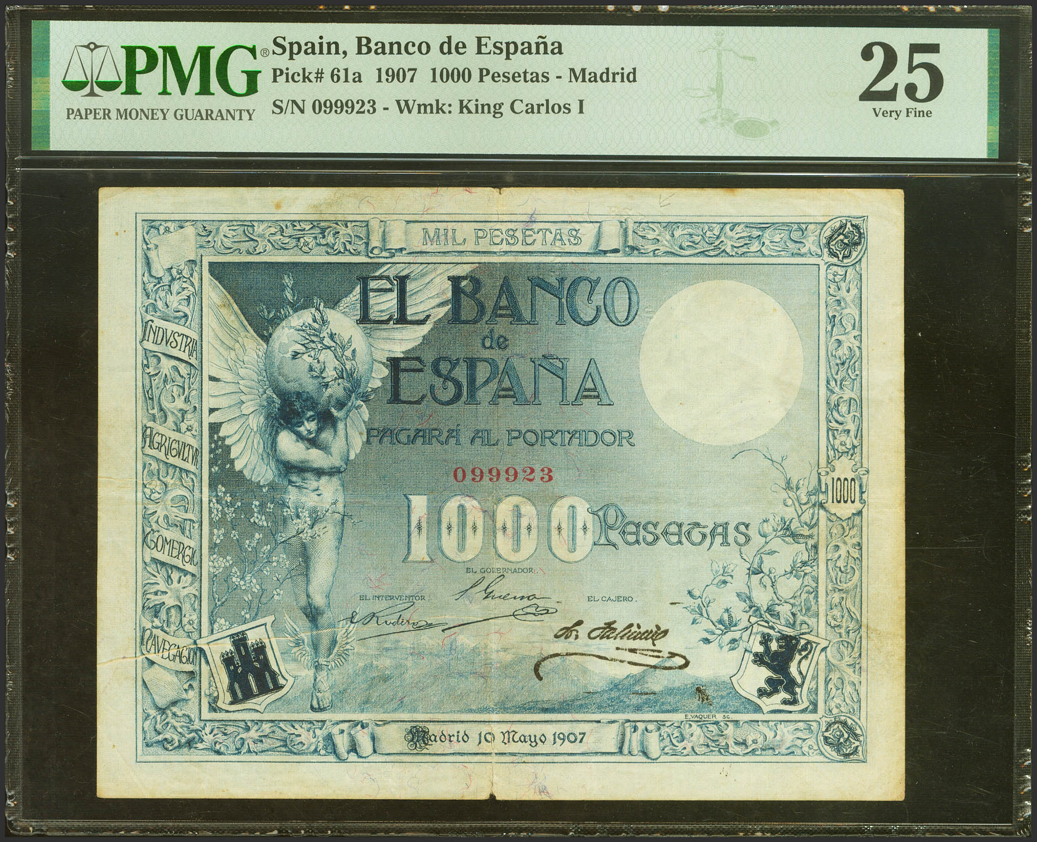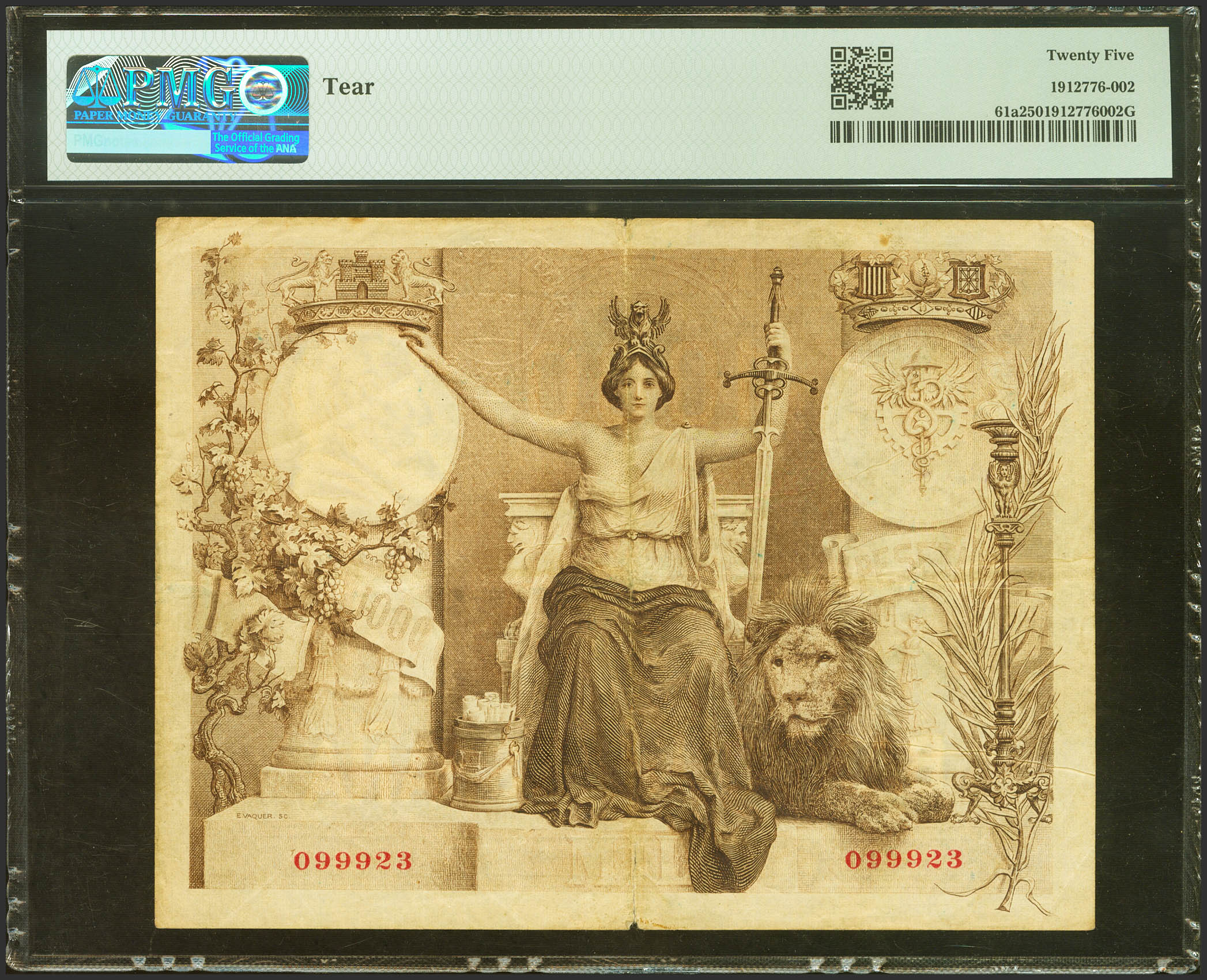 1000 Pesetas. 10 de Mayo de 1907. Sin serie y sello en seco ESTADO ESPAÑOL / BURGOS. (Edifil 2023: 414, Pick: 61a). Muy raro, especialmente sin ninguna reparación. MBC+. PMG25 (tear).