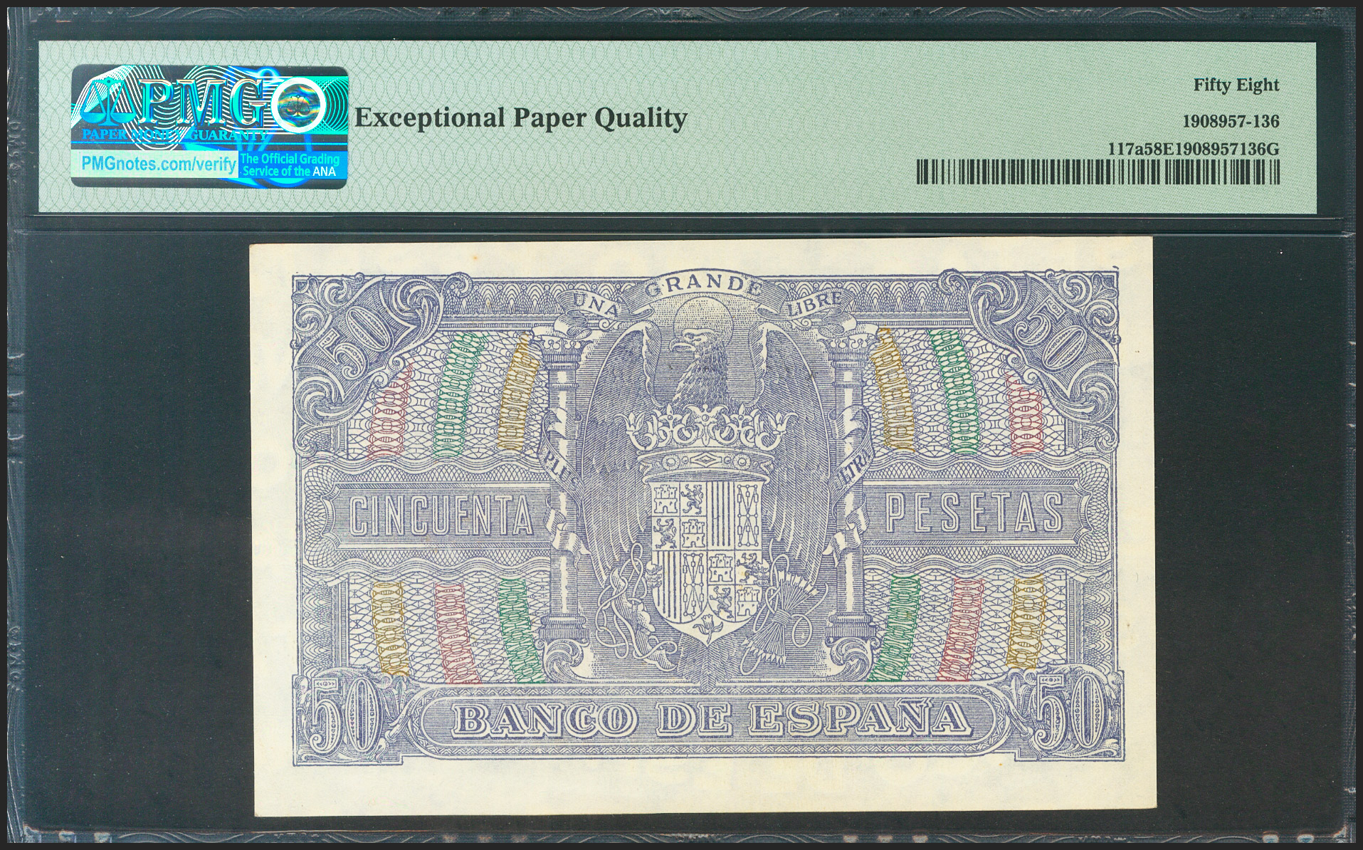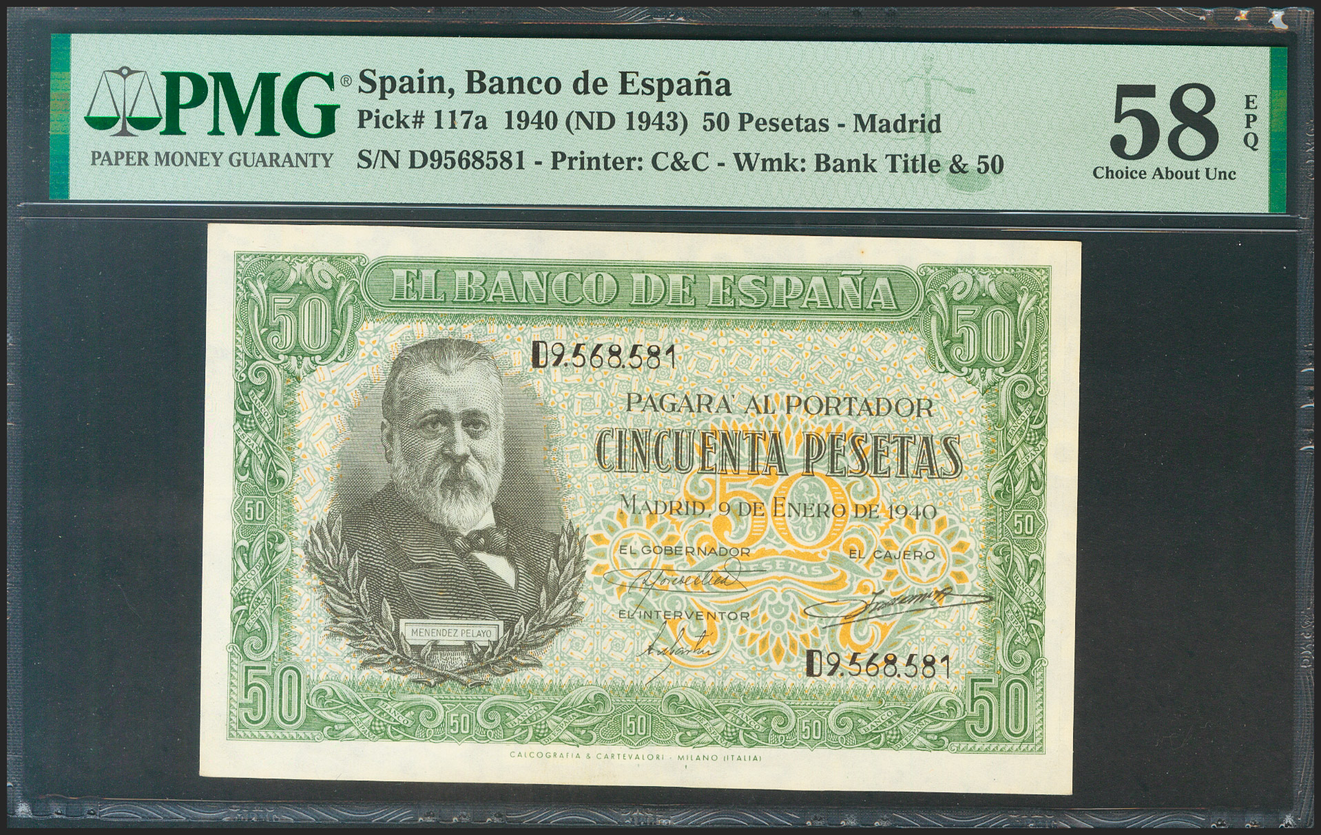 50 Pesetas. 9 de Enero de 1940. Serie D. (Edifil 2021: 437a, Pick: 117a). Apresto original. EBC+++. Encapsulado PMG58EPQ.
